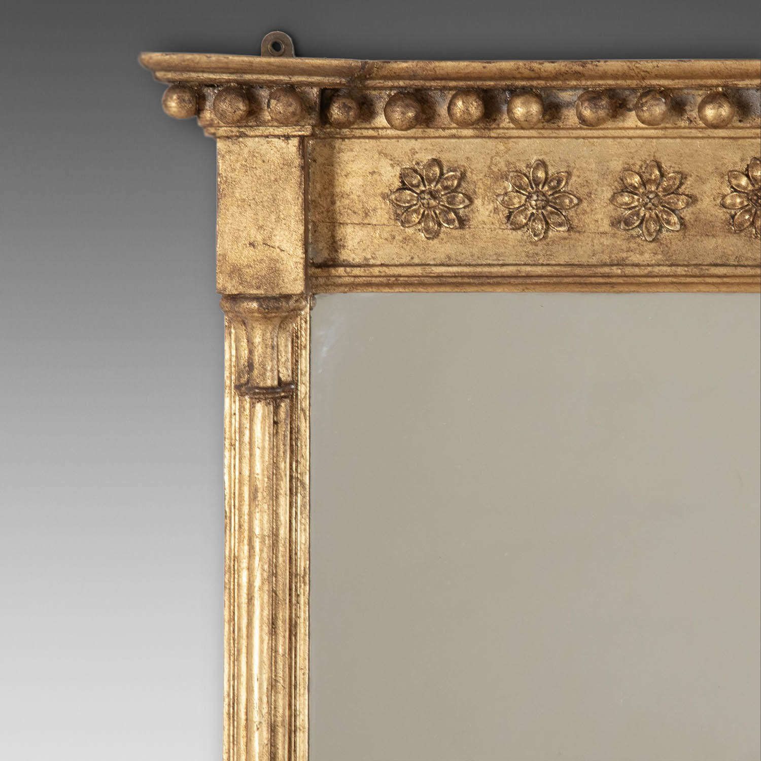 The gilt frame has pillar columns to the side and floral and gilt ball decoration to the top. Fitted with a later mirror glass to give and agent clean appearance.