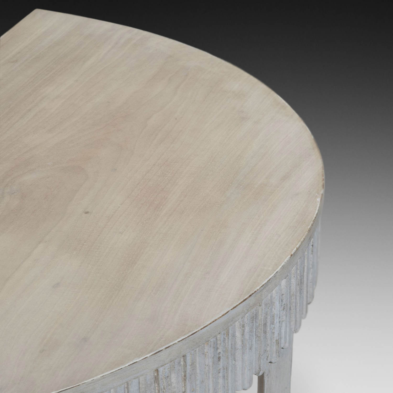 This elegant pair of tables stand on fine tapering legs. The apron has a later driftwood style decoration applied and painted in a later aged white paint finish that sets off the bleached and lime washed mahogany top. All resulting in a stunning and highly decorative pair of tables.