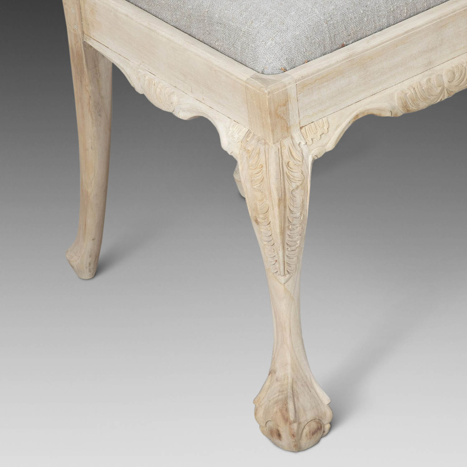 Chippendale in style, these chairs have a decorative splat back with fine decorative carvings. Standing on elegant cabriole front legs, finished with a ball and claw foot. The comfortable drop in seats are covered in a natural linen. With the bleached treatment and natural linen upholstery.