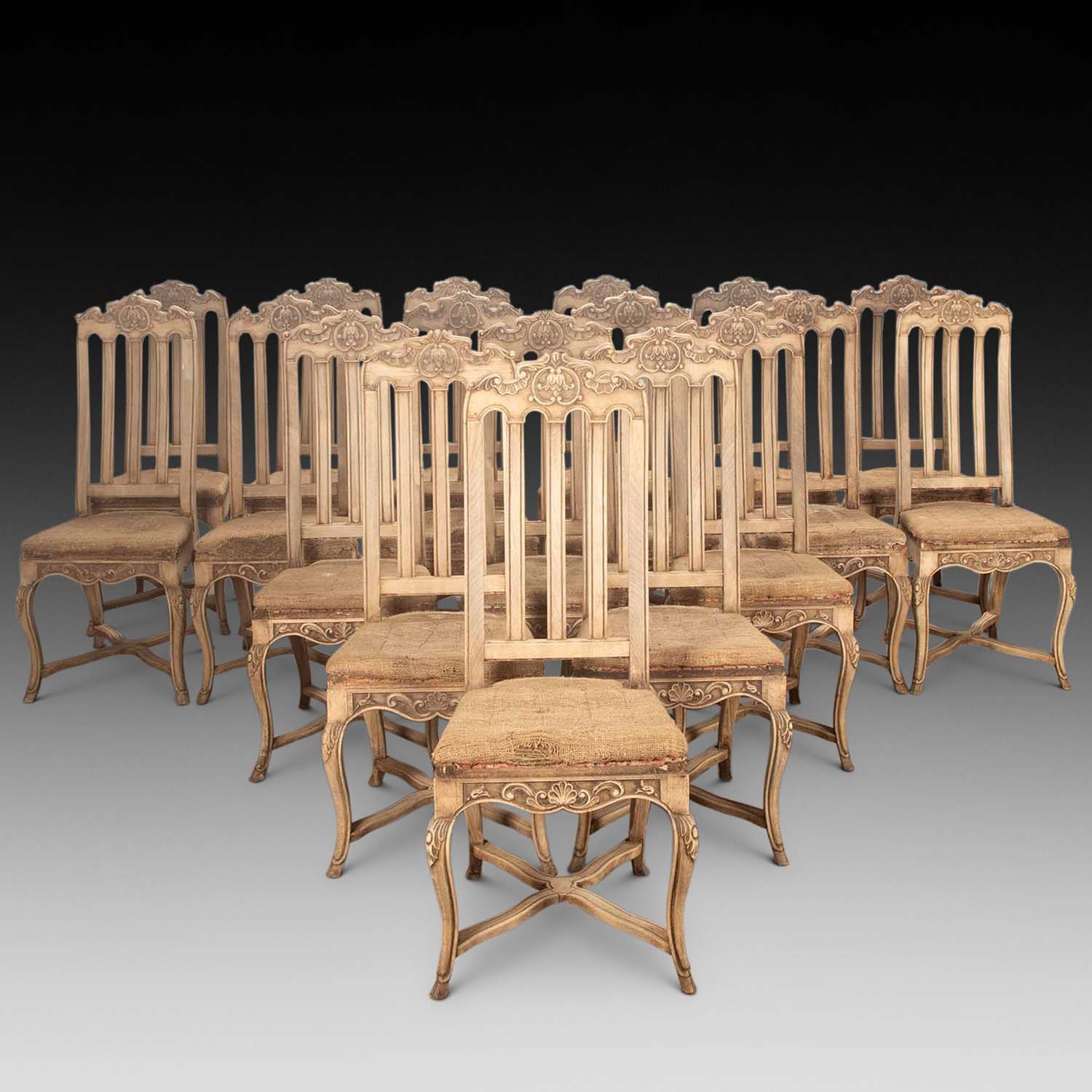 Set of Eighteen French 19th Century Bleached Walnut and Beech Dining Chairs (SOLD)