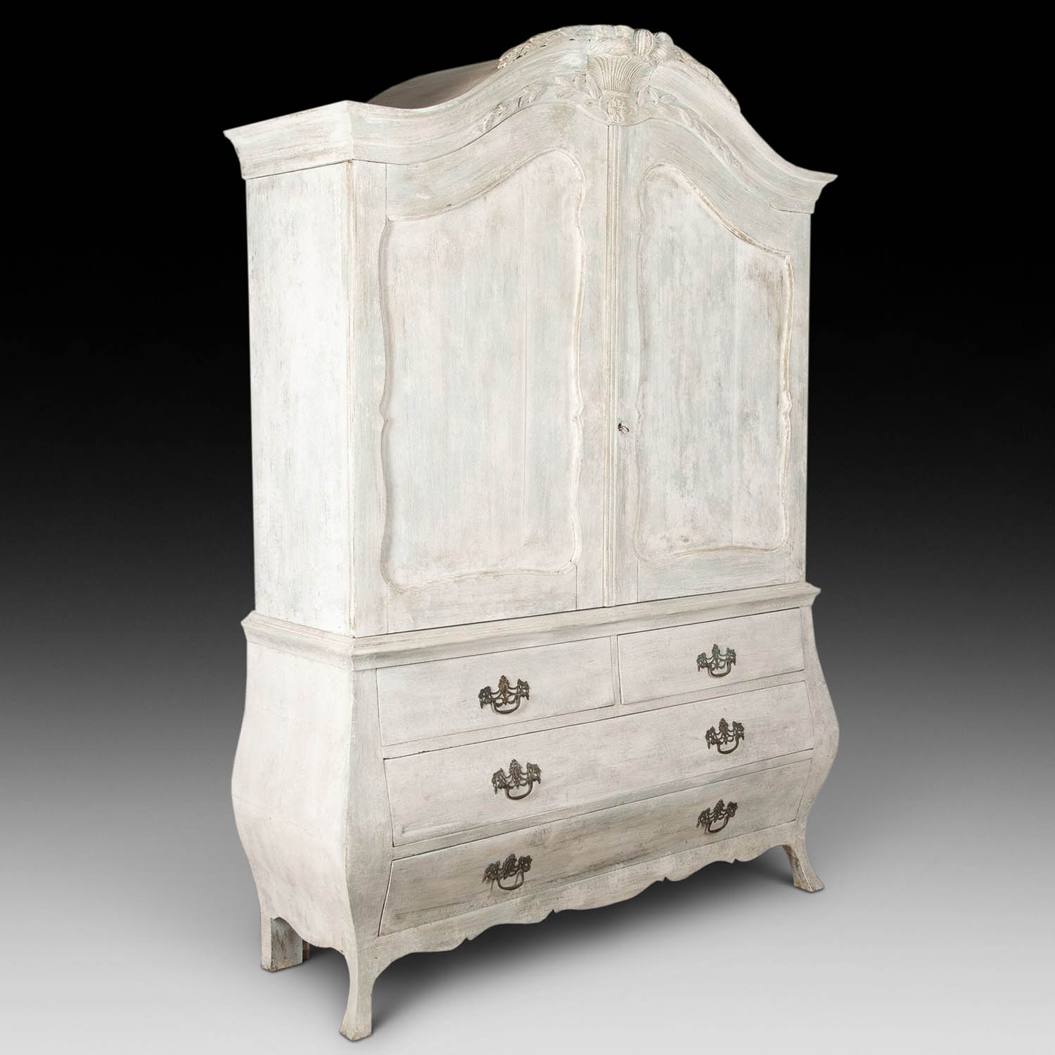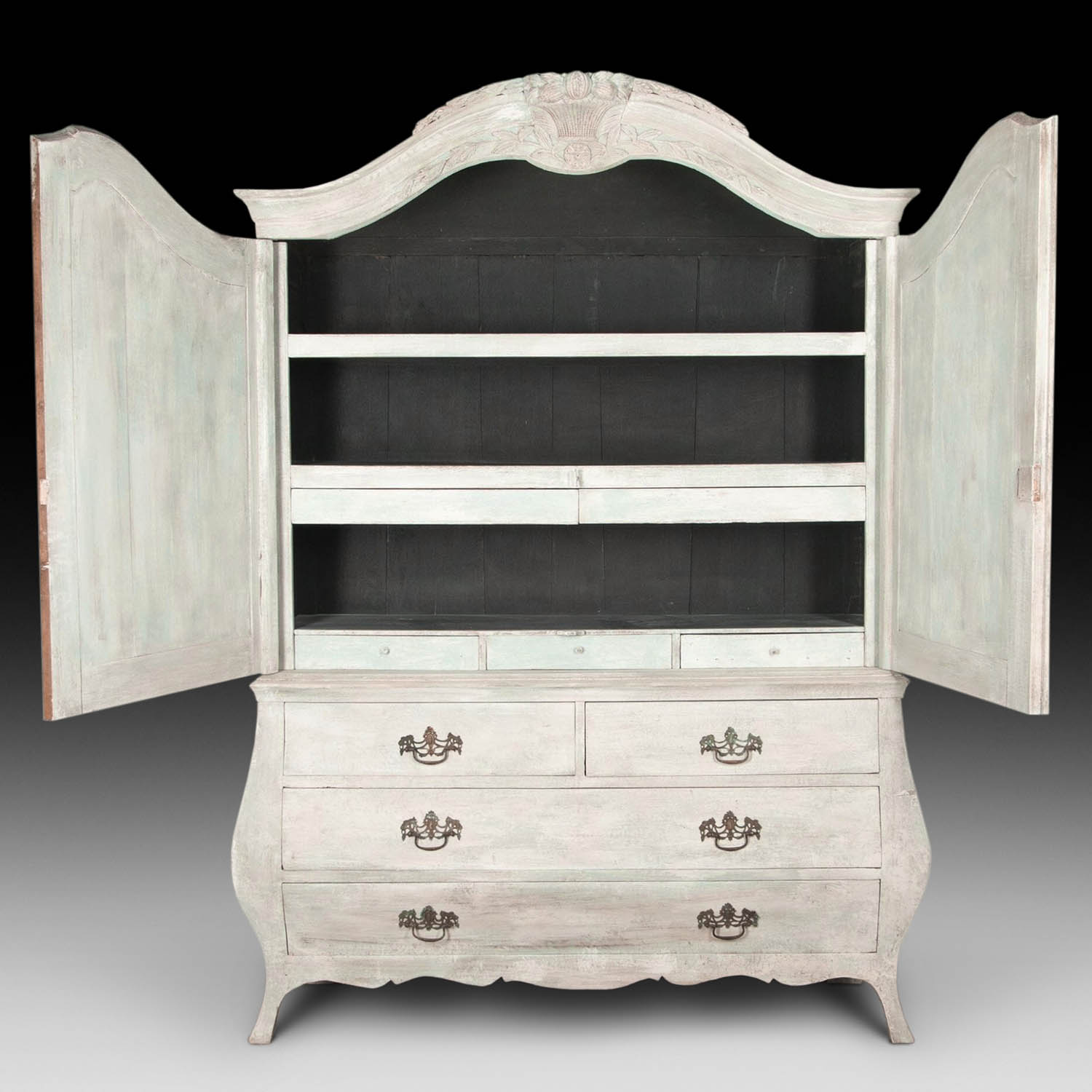 Behind the shaped doors on the top section are three shelves and five small drawers.