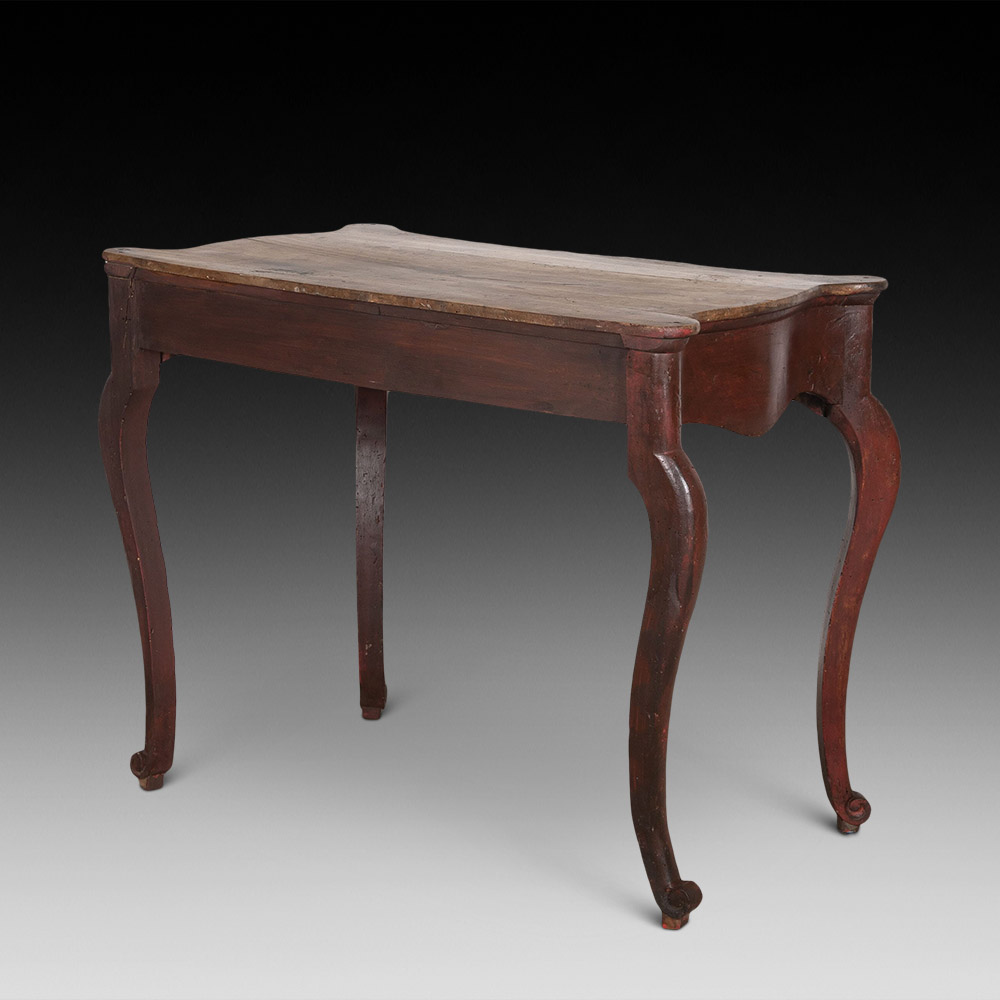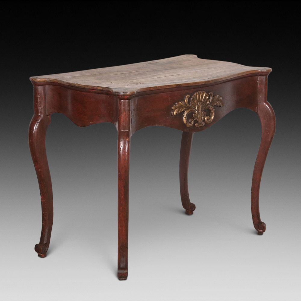 With a waxed walnut top that has good colour and patination. The piece stands on four later painted, elegant cabriole legs and the painted frieze as a period gilt decoration.