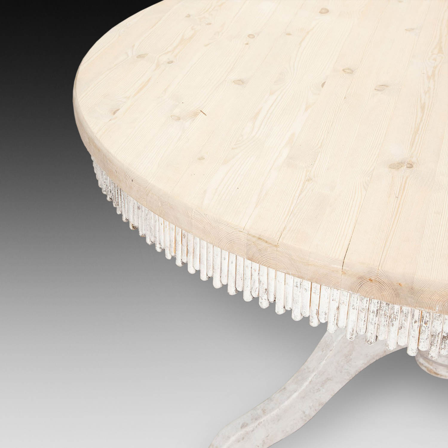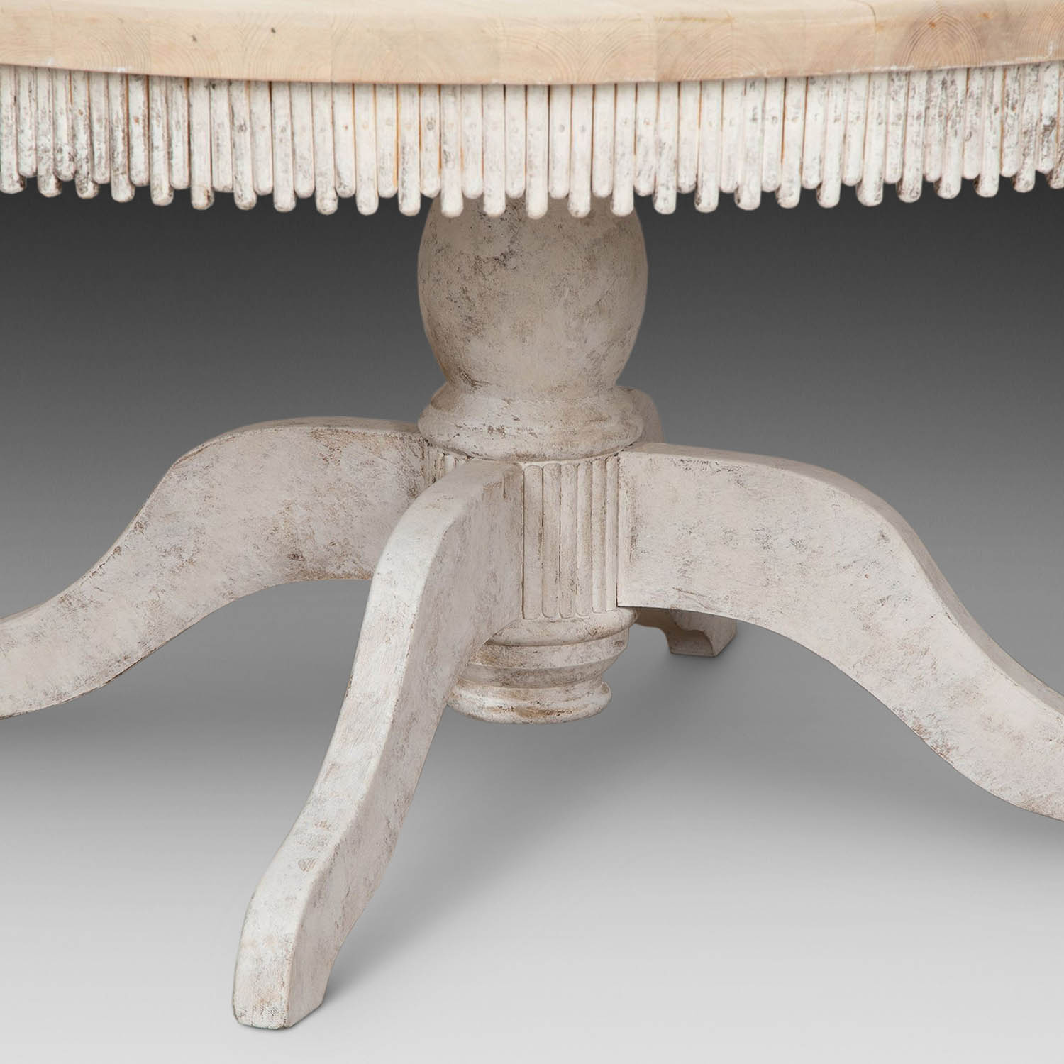 This beautiful table has a bleached pine top with a later painted old white “driftwood” edging and the top sits on a later painted splayed base, making this a very elegant, individual and yet practical table.