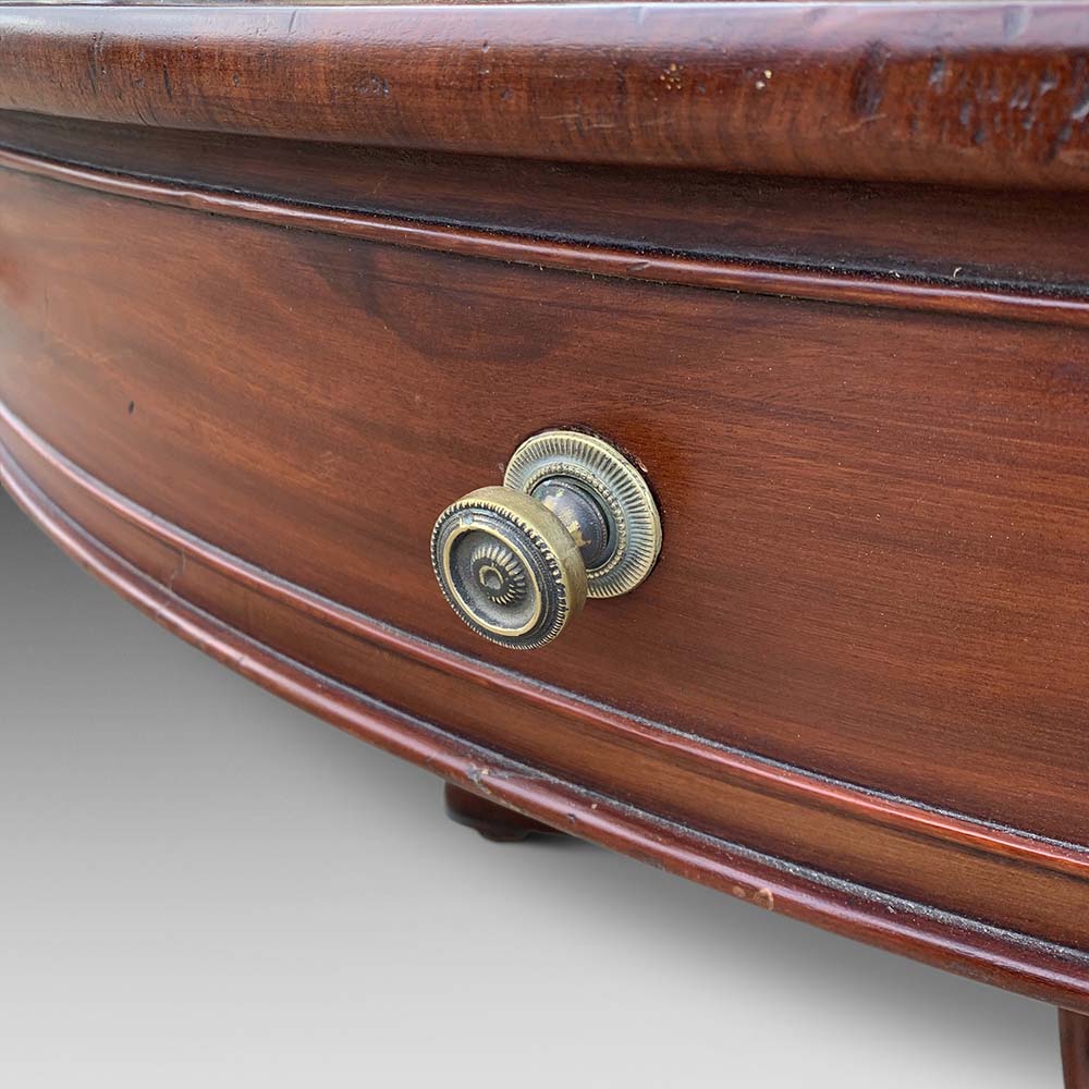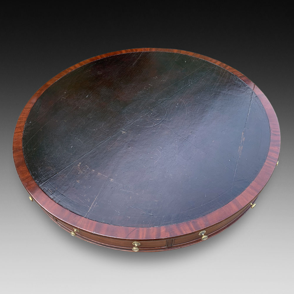This impressive table stands on a pedestal base and as its original leather top (with marks) and alternate opening drawers decorated with solid brass knobs.