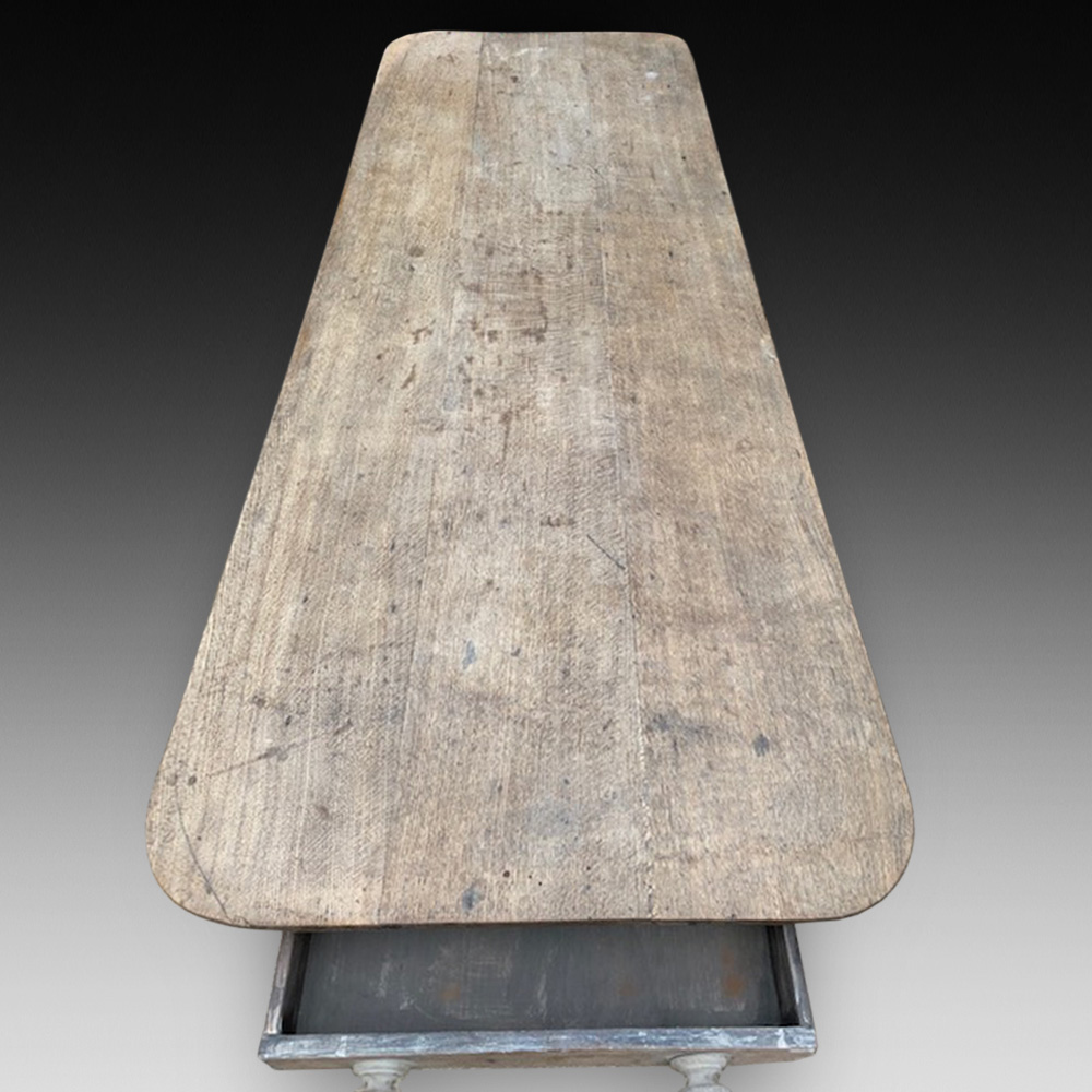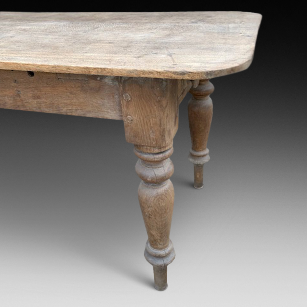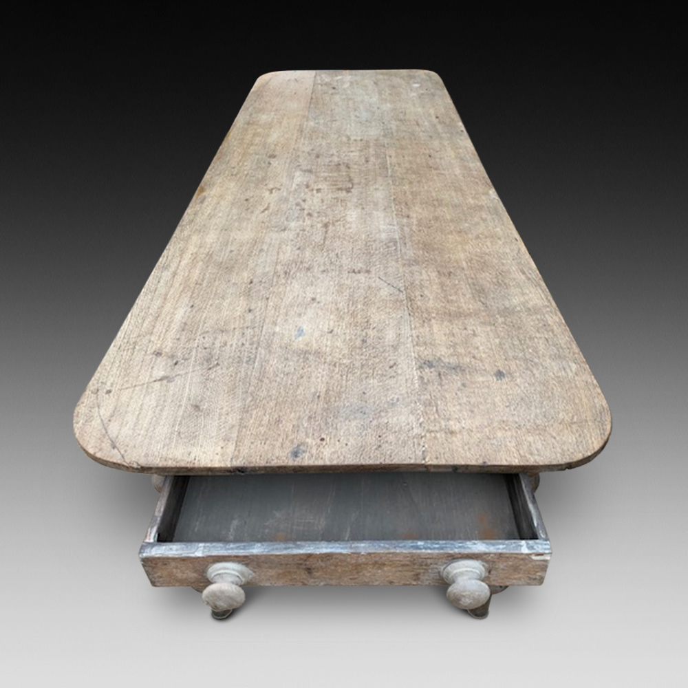 Standing on four turned legs this lovely original table as a faded oak planked top and a single drawer at one end.