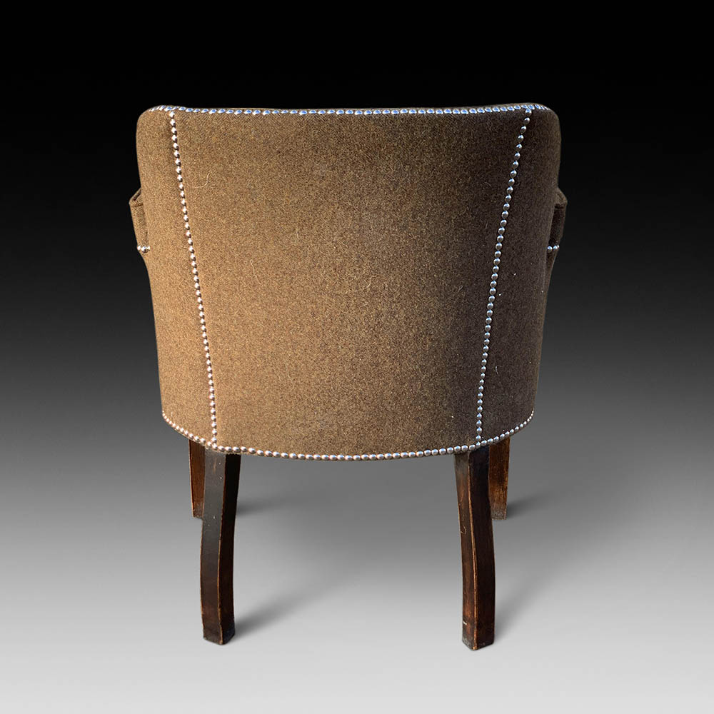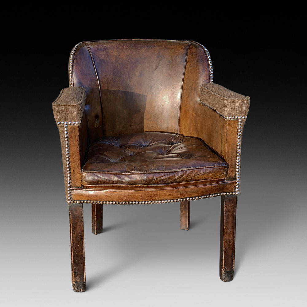 We’ve managed to retain the original leather to the inside back and the seat but have replaced the badly damaged leather with tweed on the back and sides. To give a lovely mix of traditional/contemporary.