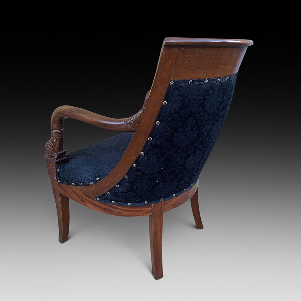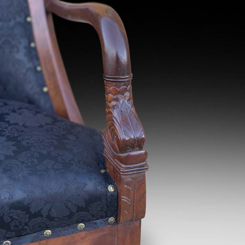 An attractive pair of stylish mid C19th mahogany armchairs, covered in a black damask fabric, these chairs stand well and have a crisp carved decoration to the arms.