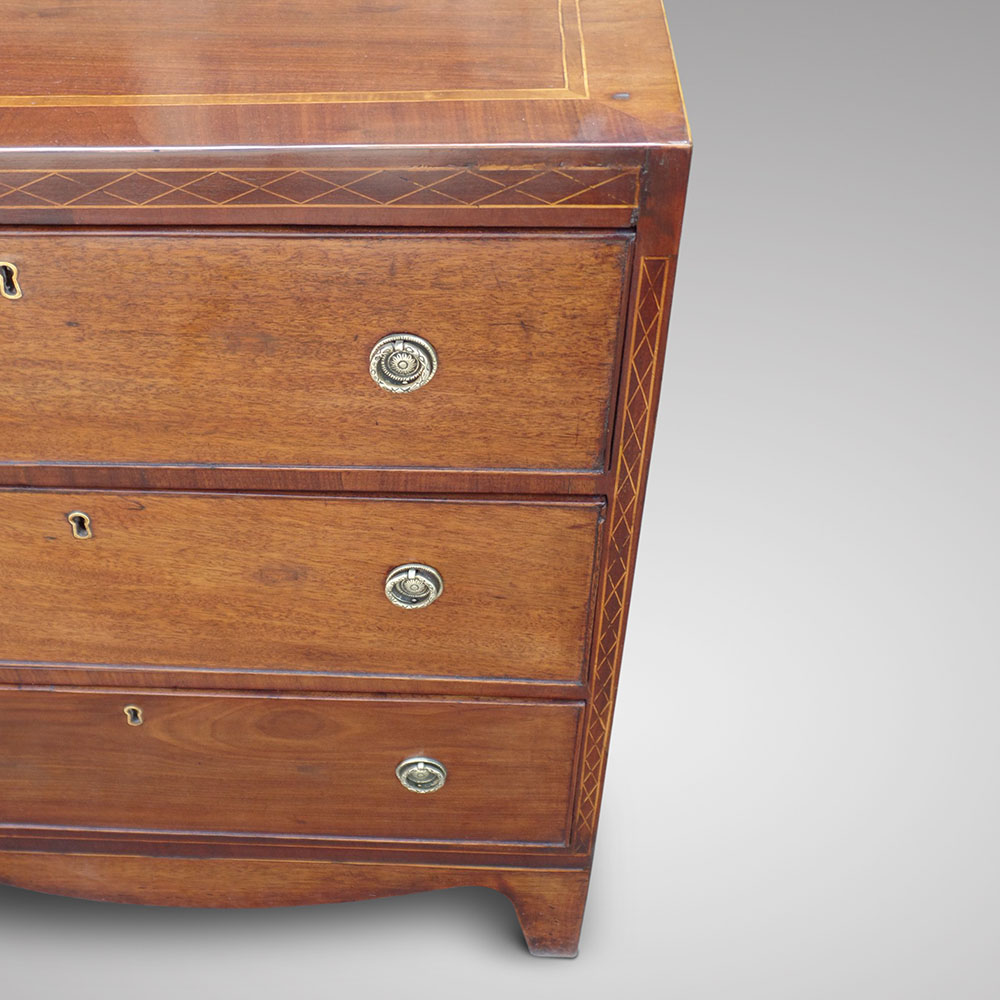 An attractive and yet useful three drawers, Mahogany Chest of Drawers. This piece has satinwood inlay decoration and the drawers are decorated with detailed brass ring handles.