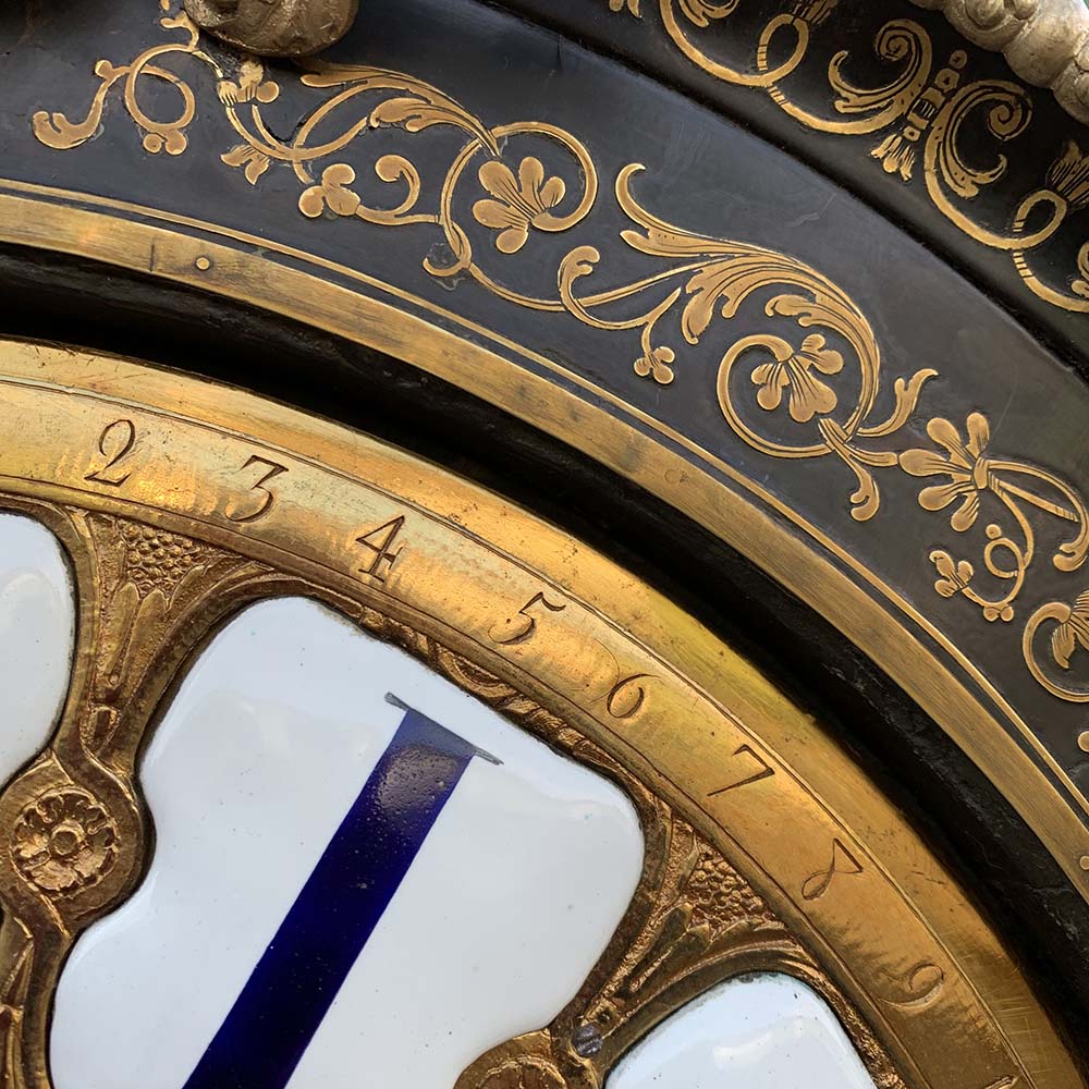 The highly Intricate brass & Guilded dial is decorated with ceramic numerals and again is signed “MYNUEL A PARIS” on a ceramic plaque below the dial.