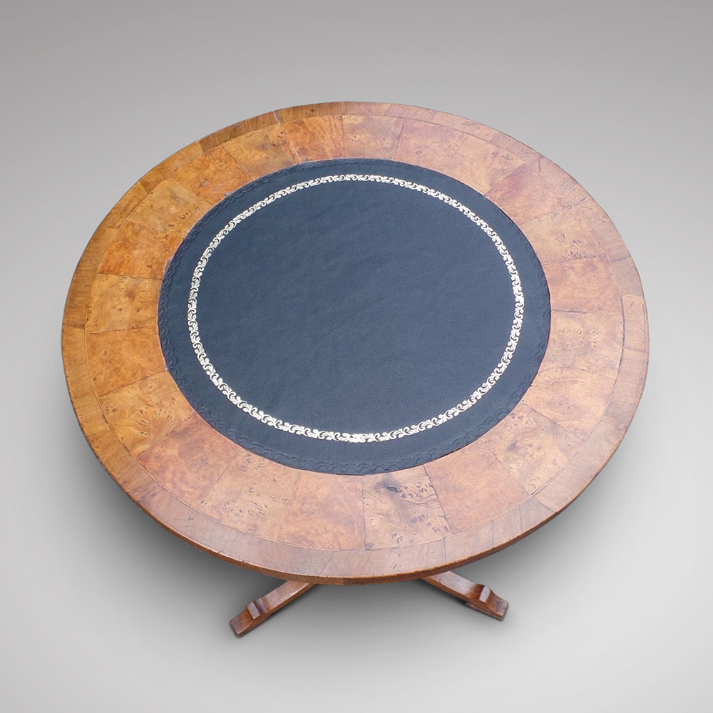 With an elegant walnut base with a burr oak top that's fitted with a black, gilt tooled leather insert.