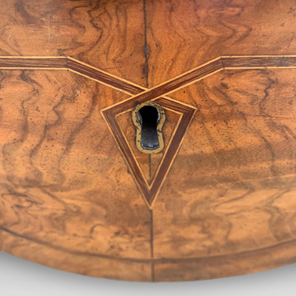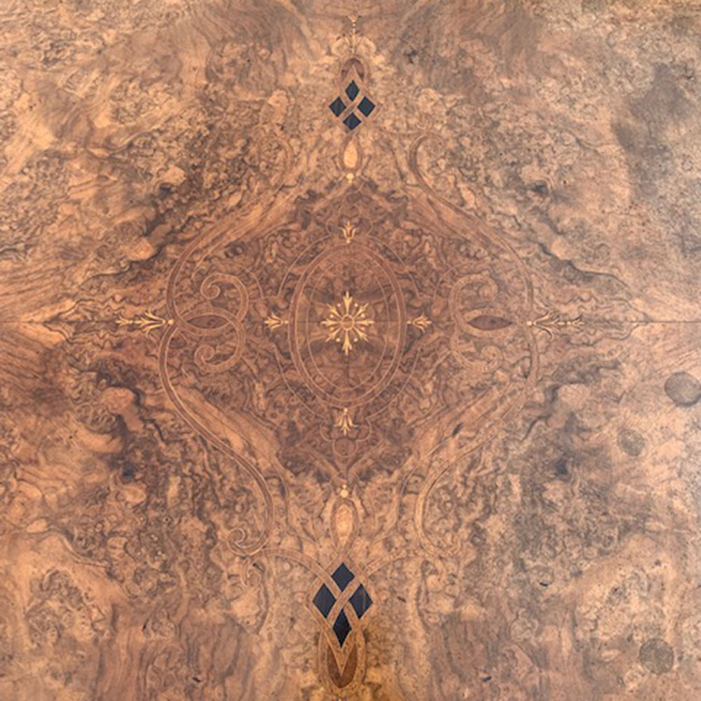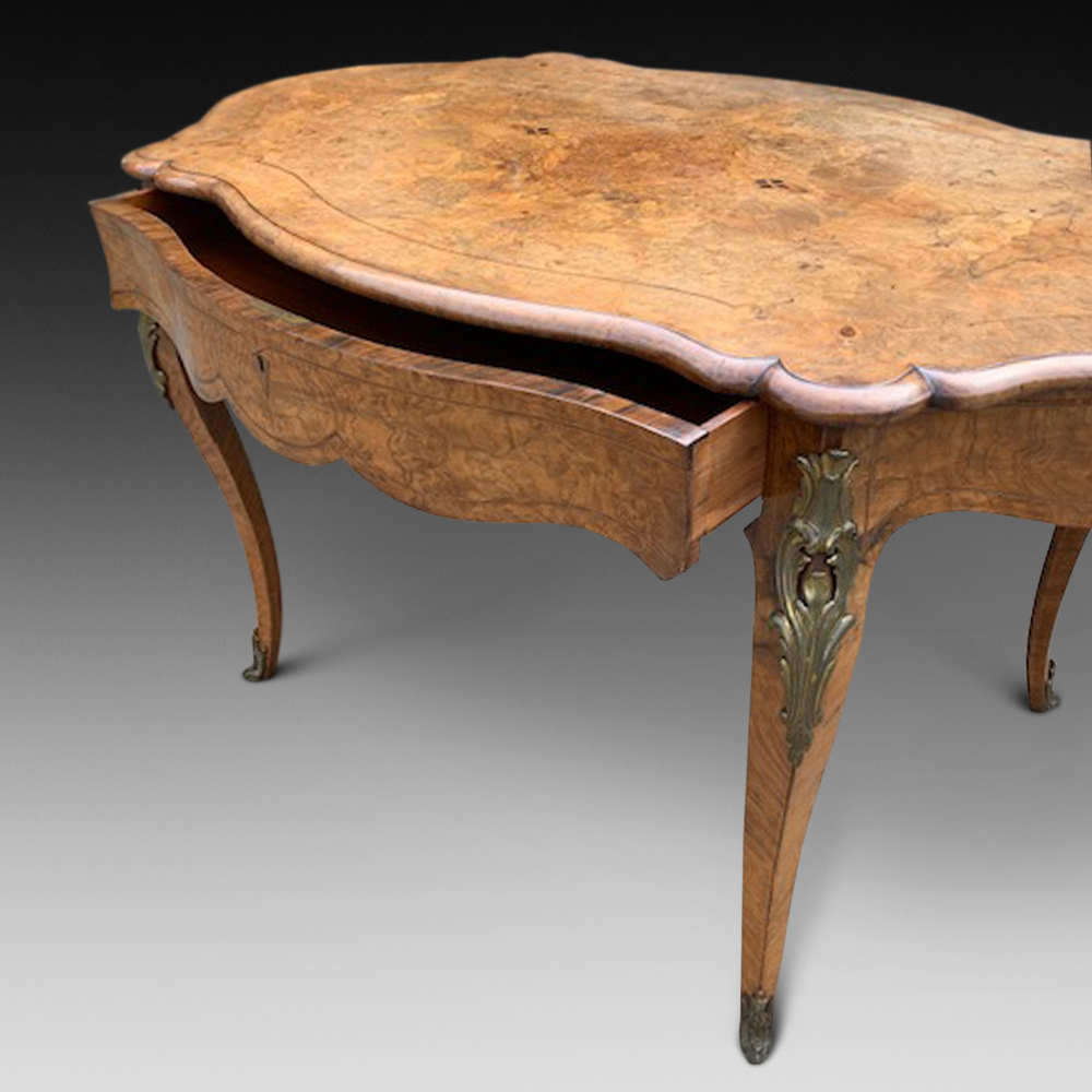 This stunning table has a single drawer, fine quality inlay to the top and drawer estcuchon and the four cabriole legs are decorated with brass mounts.