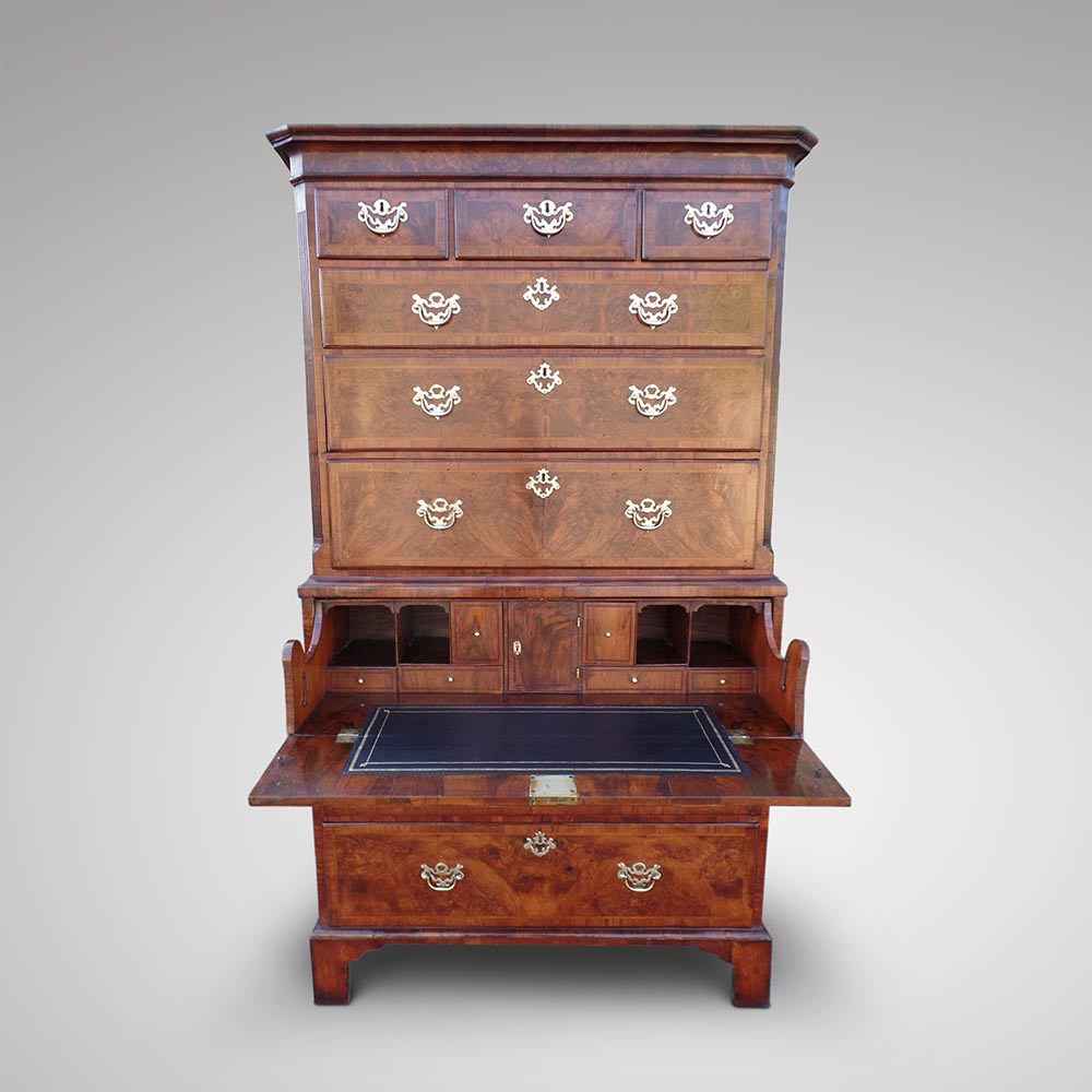 This very attractive piece has a beautiful grain structure and colour to the drawer fronts and the oak lined drawers are decorated with solid brass swan neck handles and backplates. The top section has canted corners, well below there is a fitted secretarie drawer with a leather writing surface and a selection of drawers.