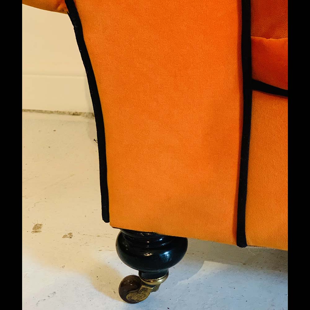 This eye catching mid 19th century day bed, with Ebonised turned legs and covered in a vibrant orange velvet fabric with contrasting black piping & buttons.