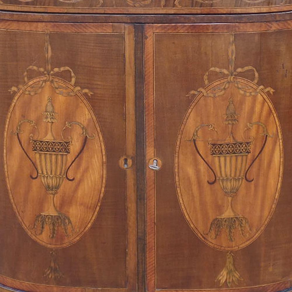 Made from fiddle back mahogany, this piece is decorated with high quality marquetry, the base has a double centre cupboard that is flanked by two single cupboards which still retains the original key.