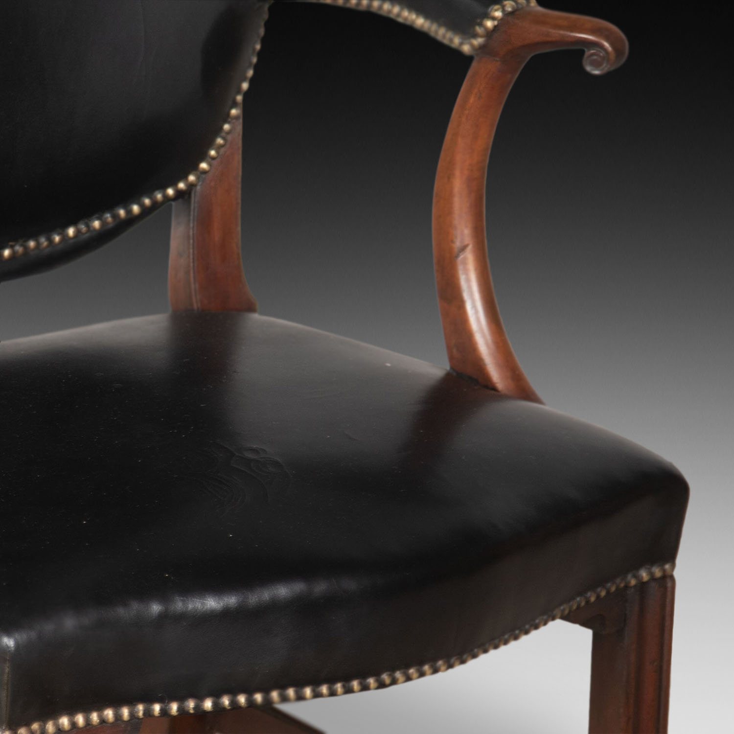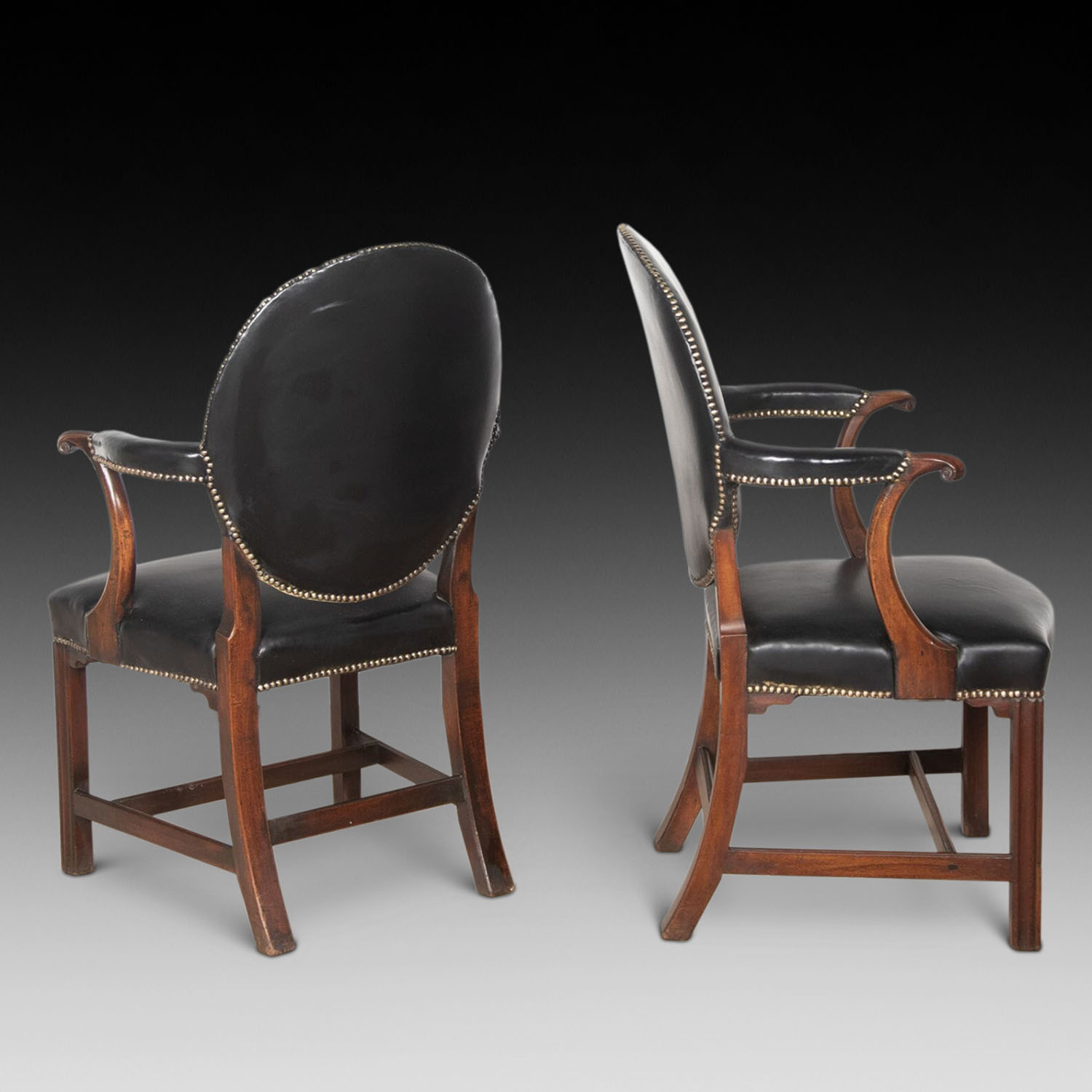With black leather upholstery finished with decorative brass studding.