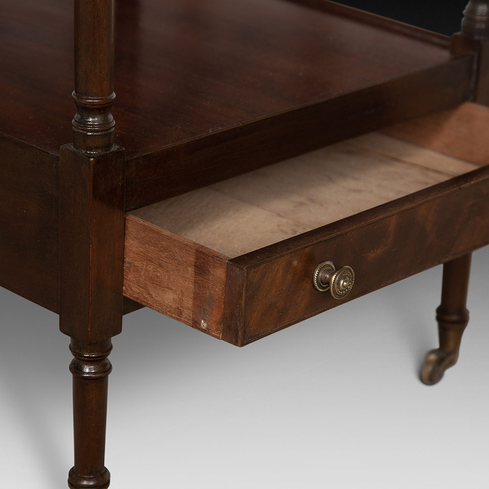 This attractive pair of whatnot’s have a single drawer in the base section and stand well on their turned legs. Fitted with their original brass castors and the shelves are supported turned uprights.