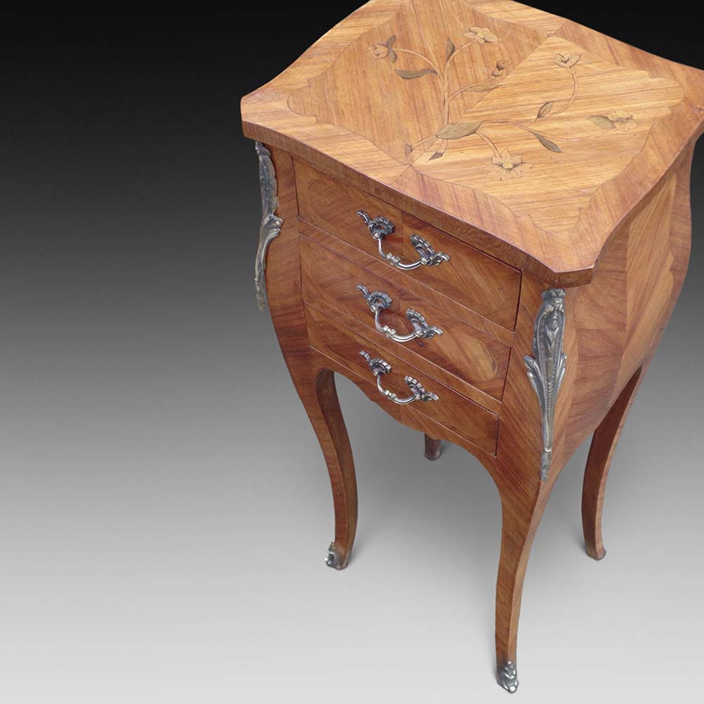 A pretty and small pair of kingwood marquetry bedside cabinets fitted with their original and decorative brass handles and mounts.