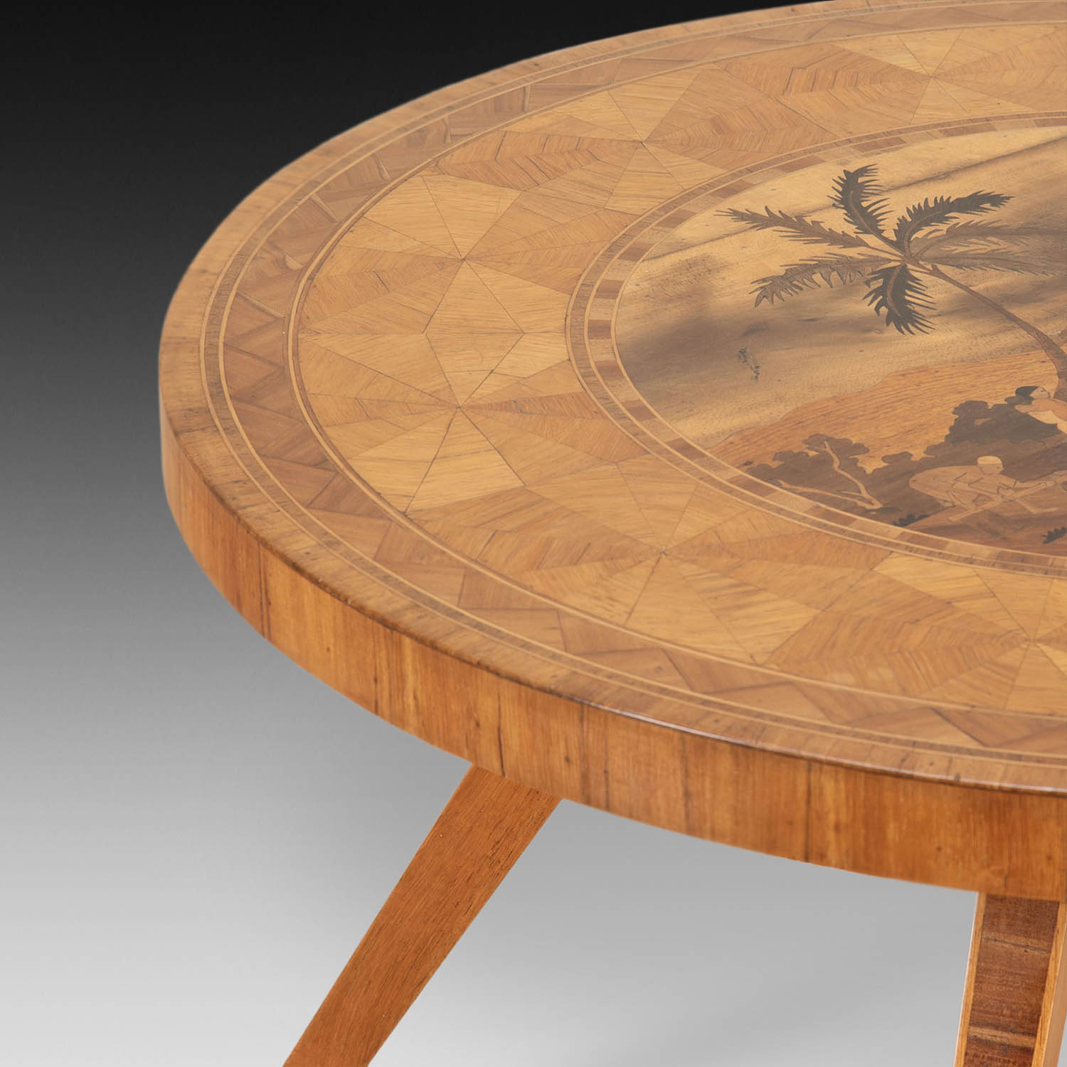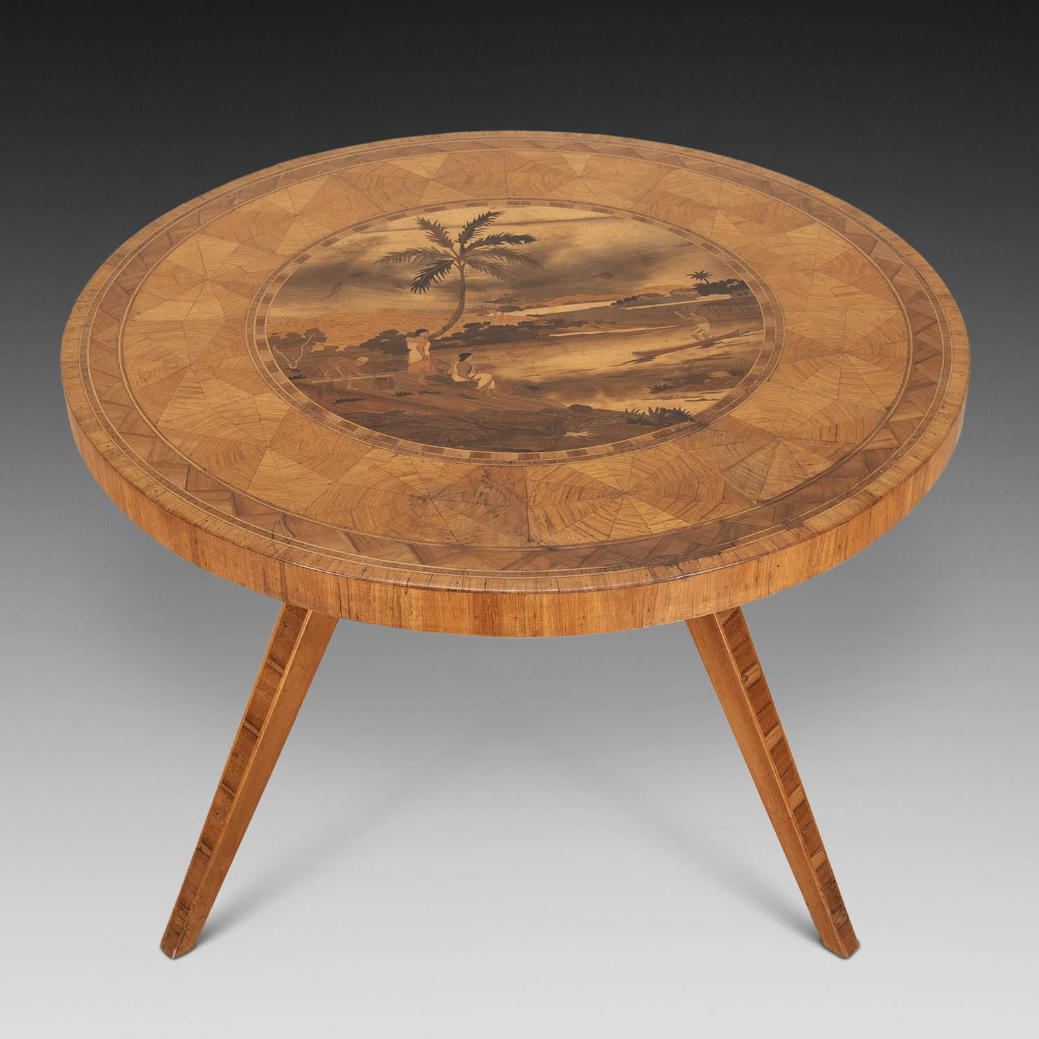 This beautiful piece depicts a scene possibly from the South Sea Islands of the locals bringing in the 'catch of the day'. The table is not only practical but stands well on its four elegant splayed inlaid legs. A beautiful addition to any interior.