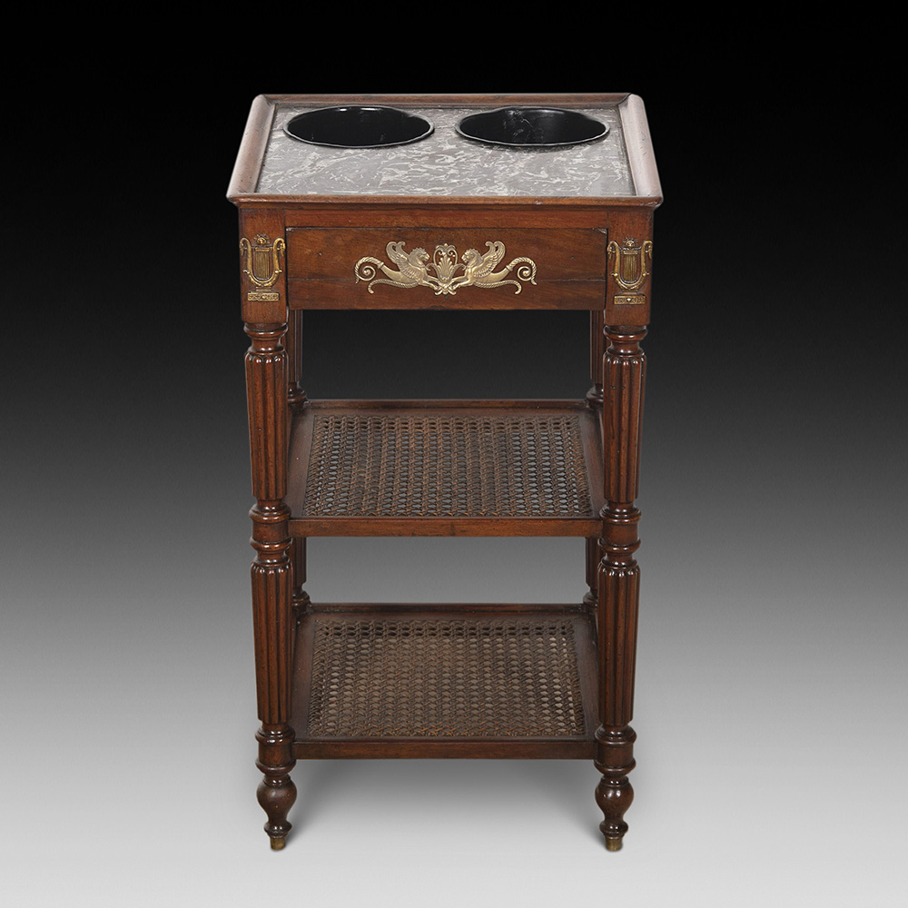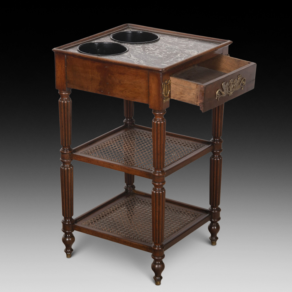 With black bottle holders that sit on the original marble top. Below is a working drawer and two cane shelves, making this a must-have table.