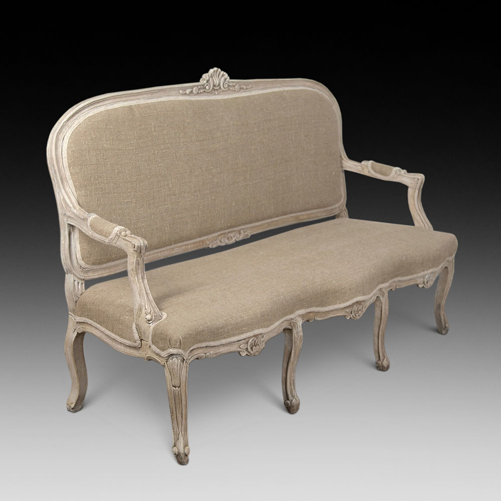 The piece is upholstered in a neutral linen fabric.