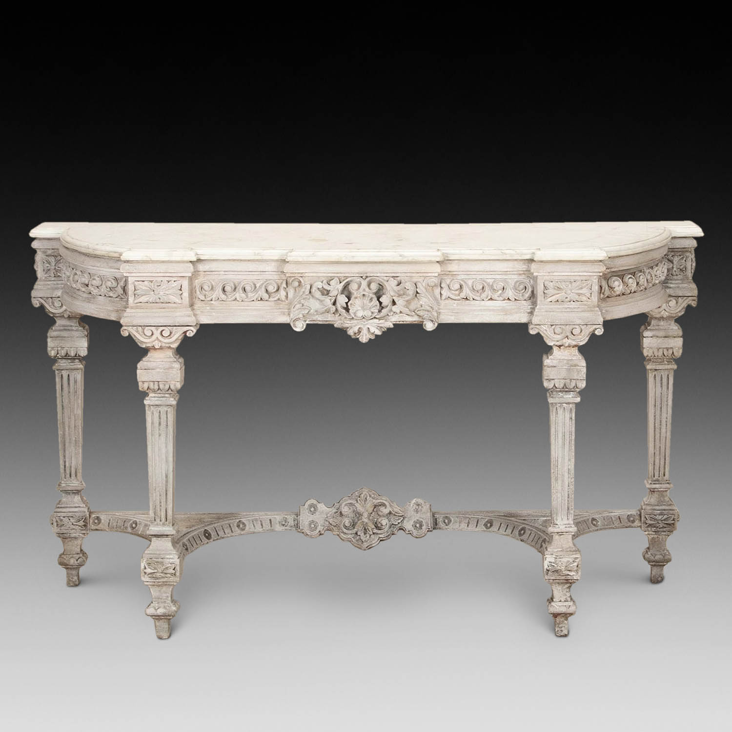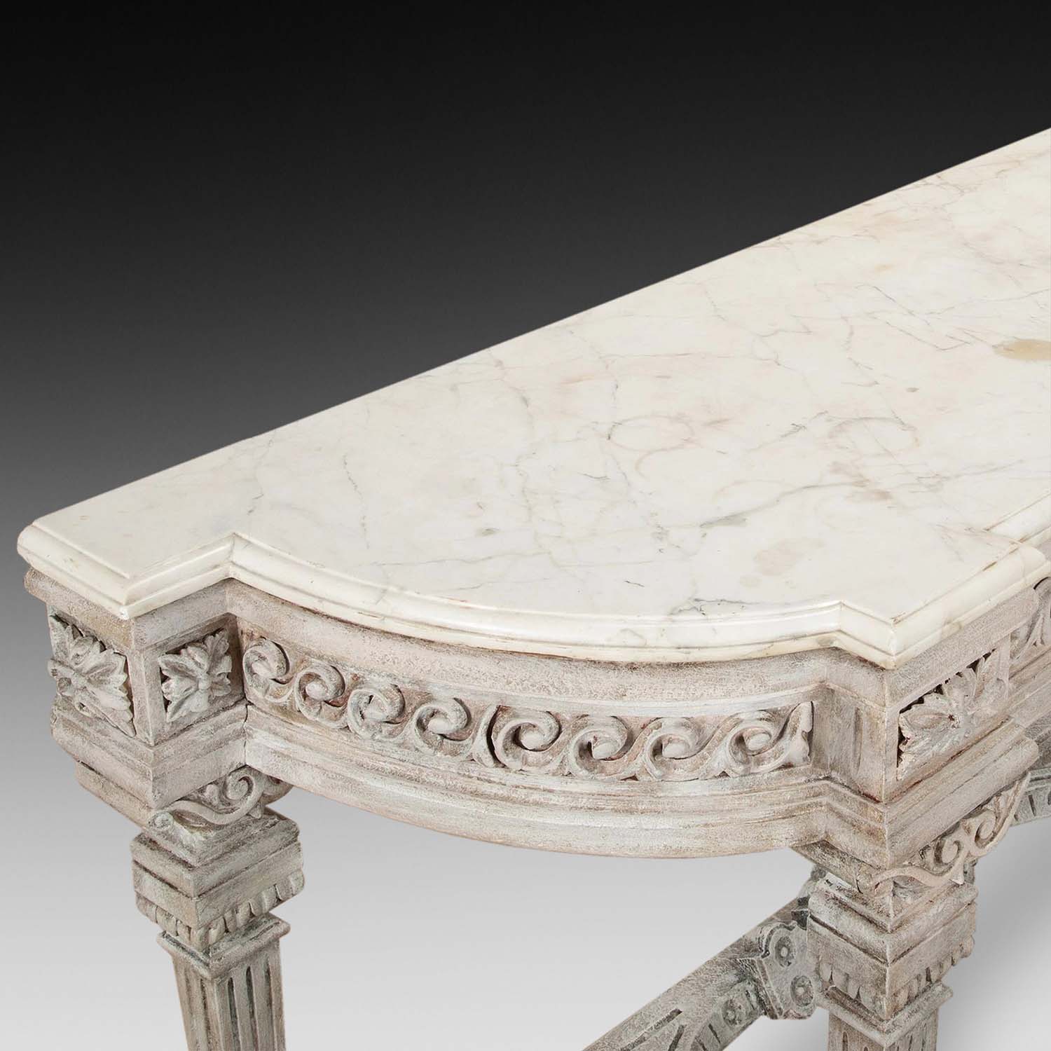 This elegant table has a great decorative look with a later old white painted finish. The table stands well on its tapering legs and has quality carved decoration and details.