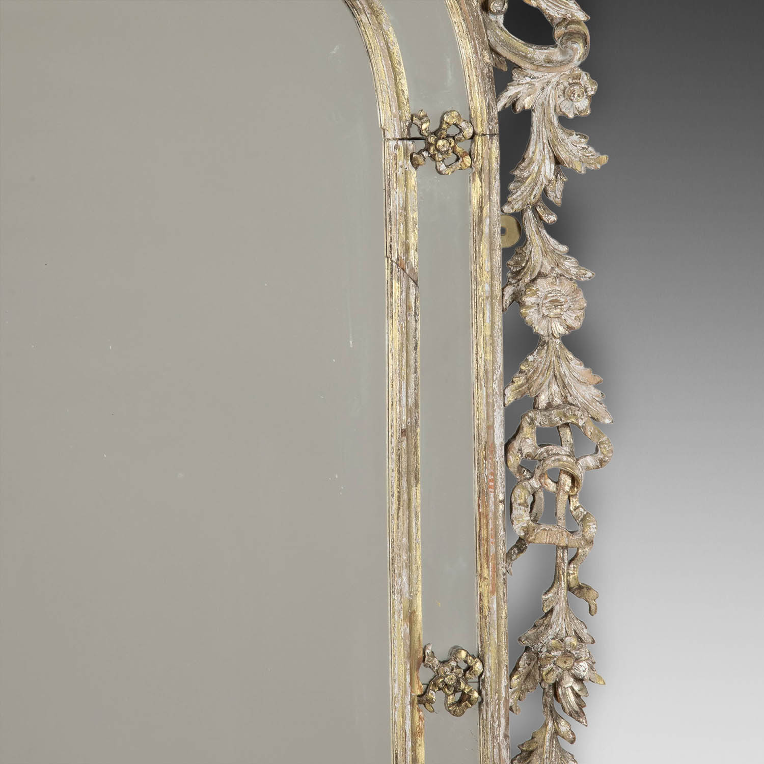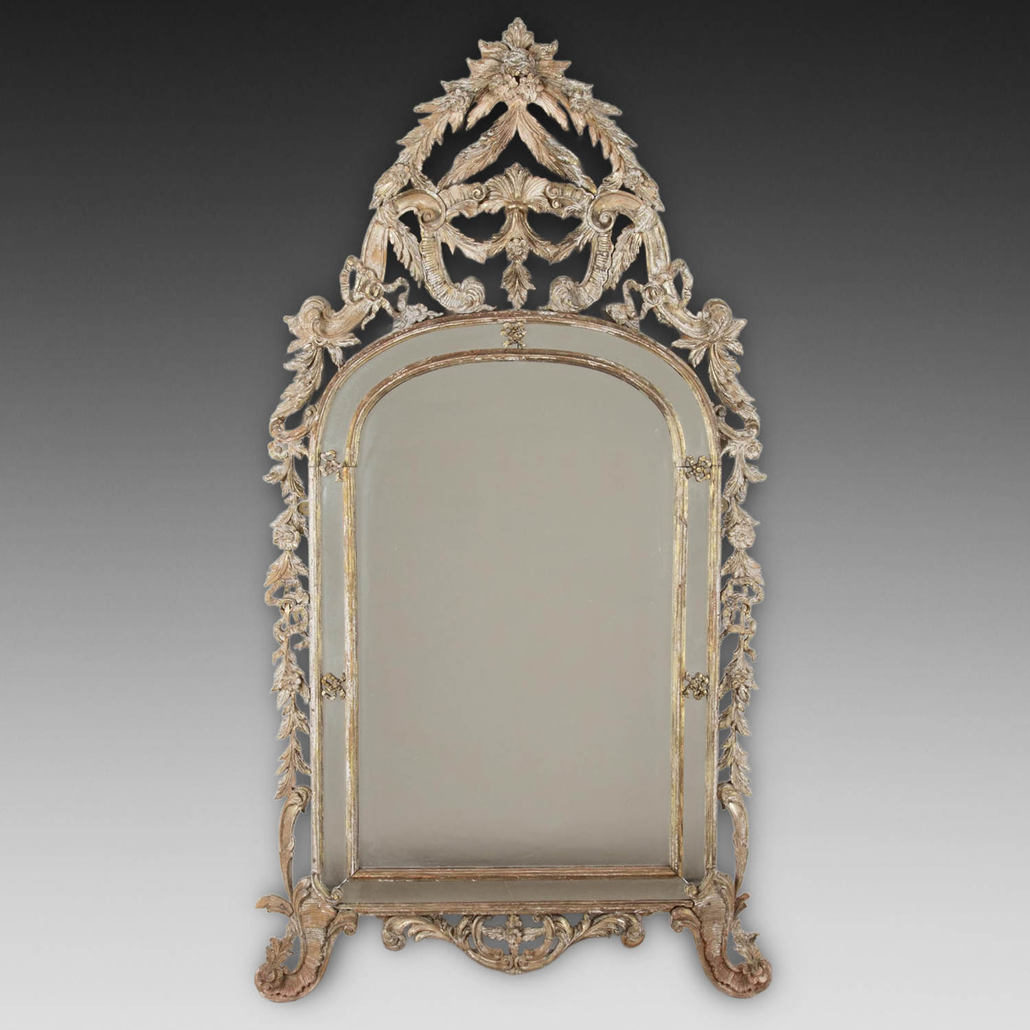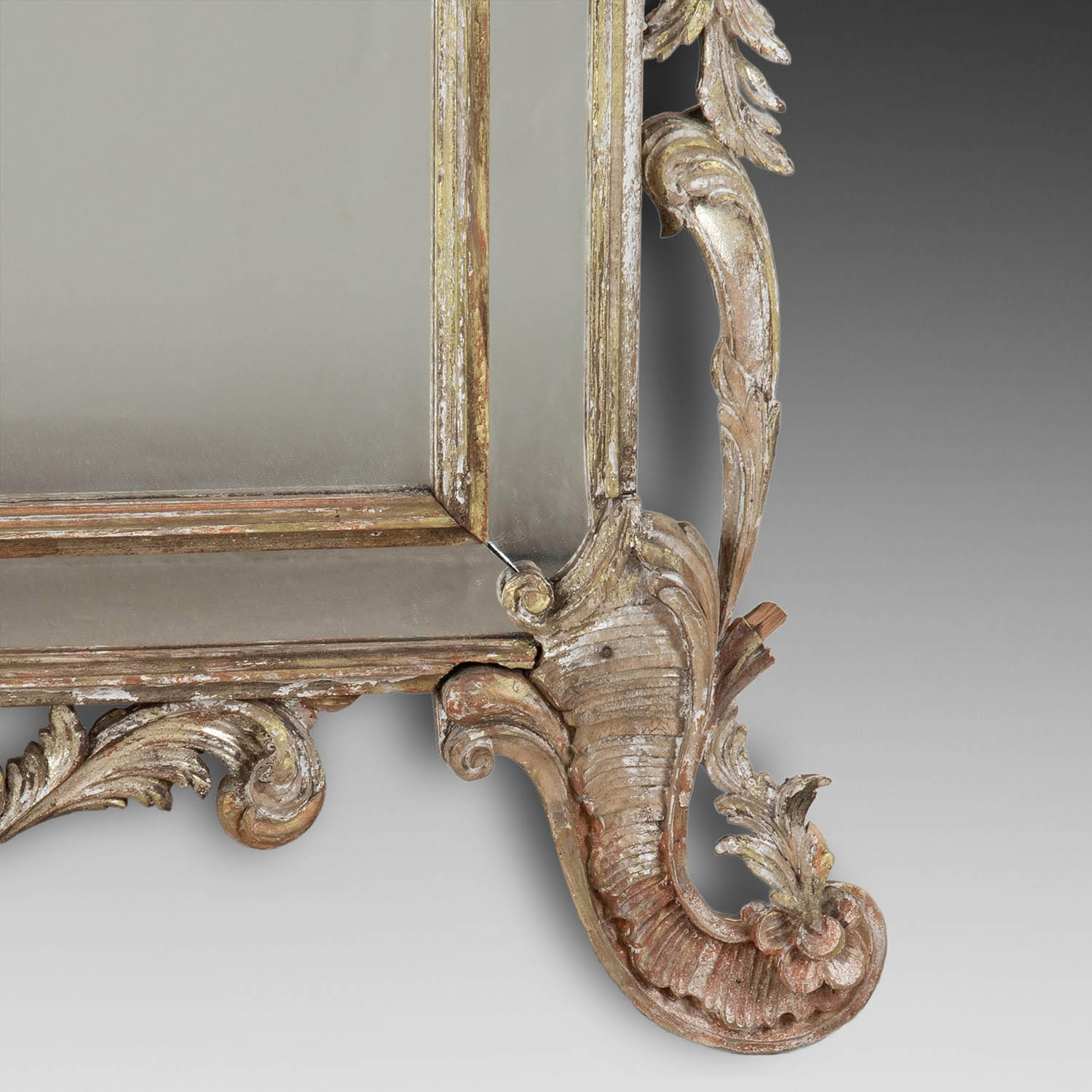 This beautiful piece has a very dry natural appearance showing various sings of wear, commensurate with age. Pieces of the original wooden frame, gesso, old paint and old and later gilding showing through in various areas, resulting in a lovely rustic look. The piece has a later mirror glass.