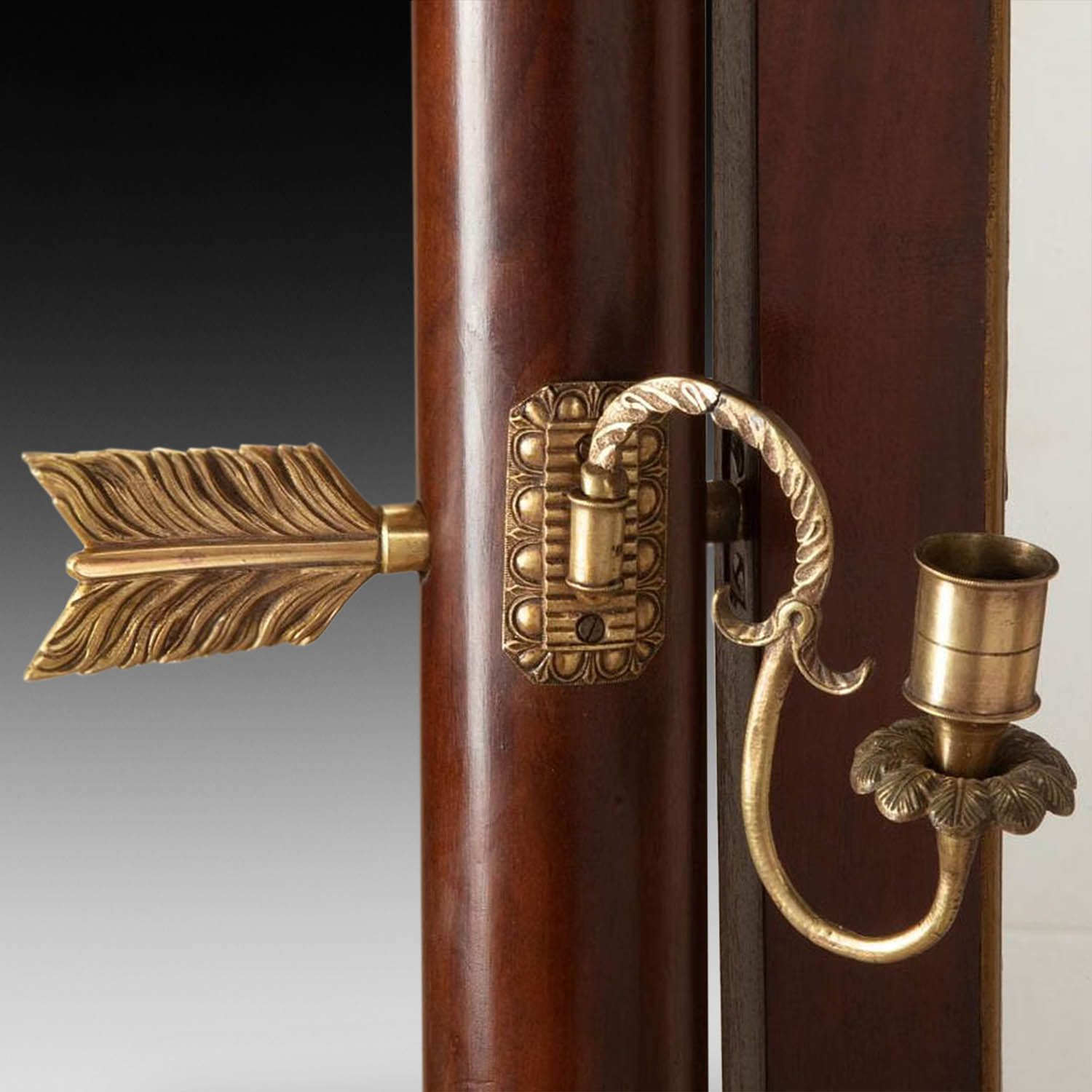 This stylish piece stands elegantly on its original guilded ram's feet. The mirror is supported on beautifully turned supports and held in place with its original brass decorative screws. The piece is also decorated in its original brass mounts, mouldings and capitals.
