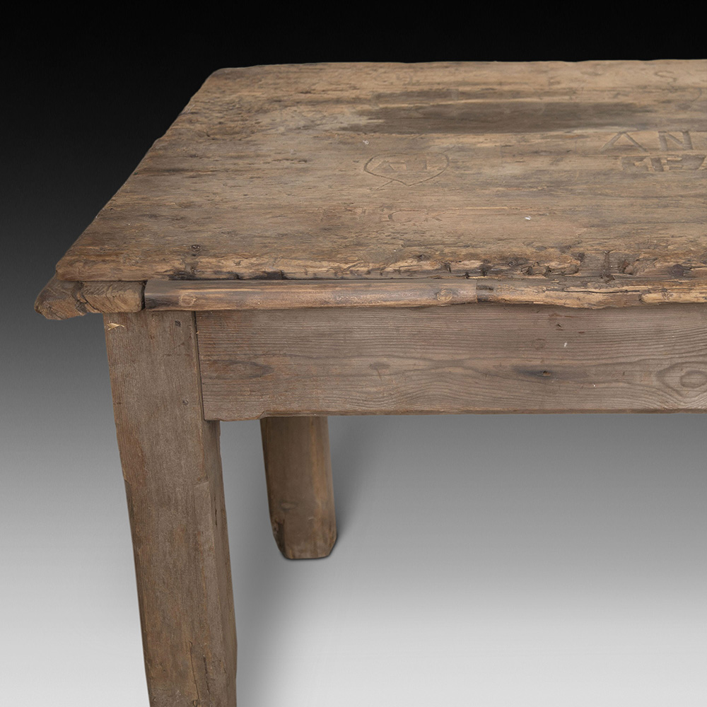 This rustic country dining table is full of character with its unusual decoration of adult Graffiti carved into the top.