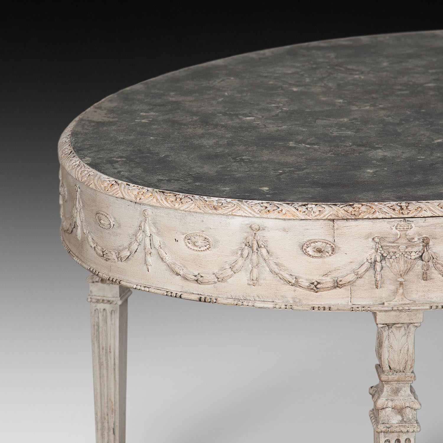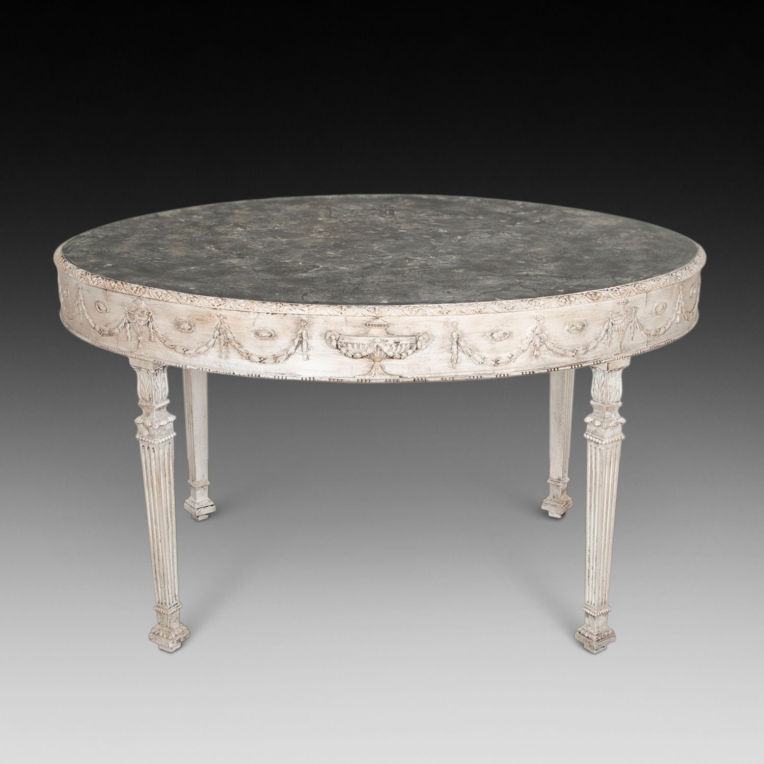 This pretty table stands on four reeded tapering legs and is well decorated around the frieze with floral decoration, bobbin moulding and carved urns. The table has a painted marble effect top.
