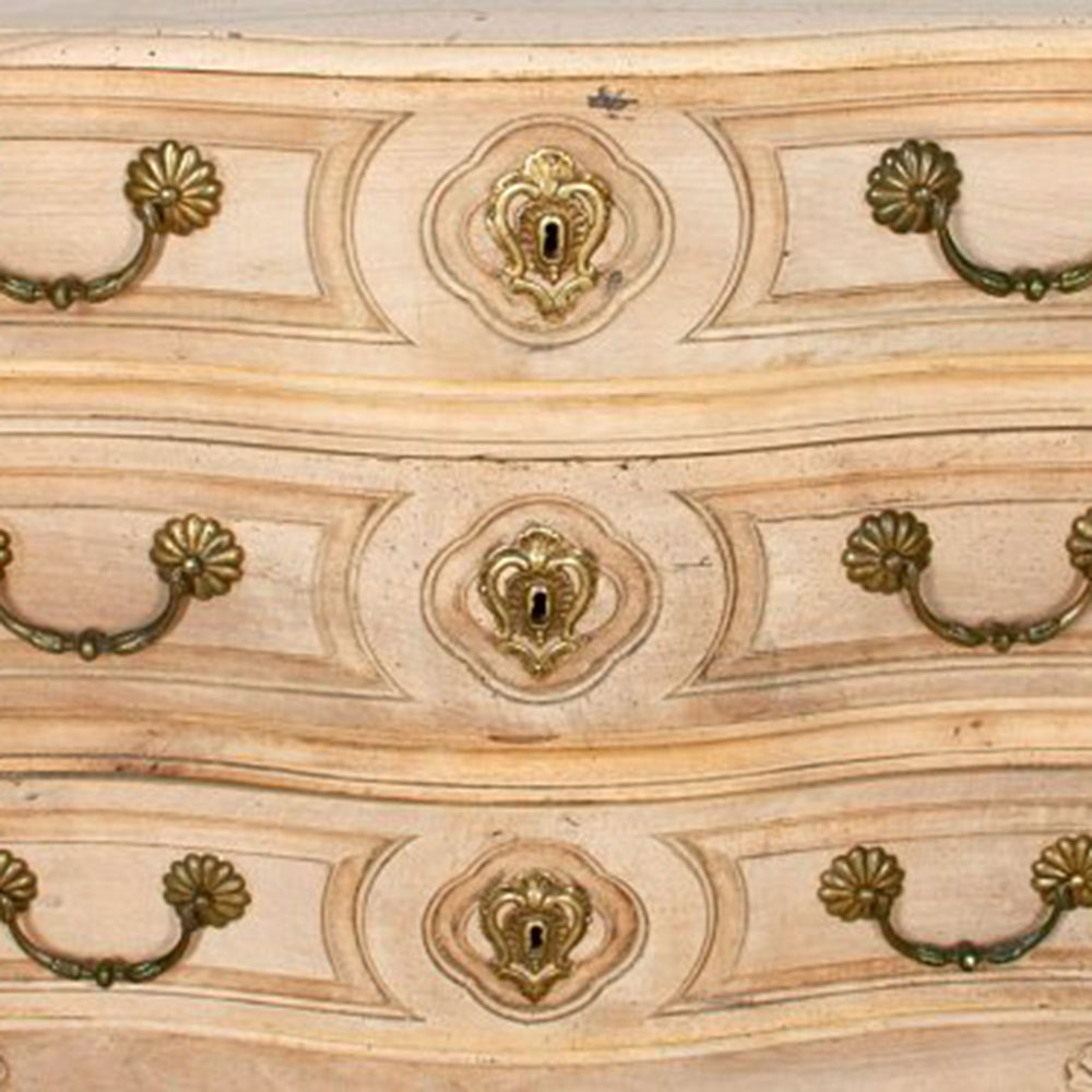 This wonderful commode has recently been bleached to reveal a fantastic colour and graining throughout. This shapely and tactile piece has three large drawers; all fully functional. Each drawer is decorated with its original, impressive brass handles which are beautifully time-worn. It stands on four cabriole legs which are supported by an elegantly carved apron. A fantastic bleached walnut commode that shall elevate all interiors.