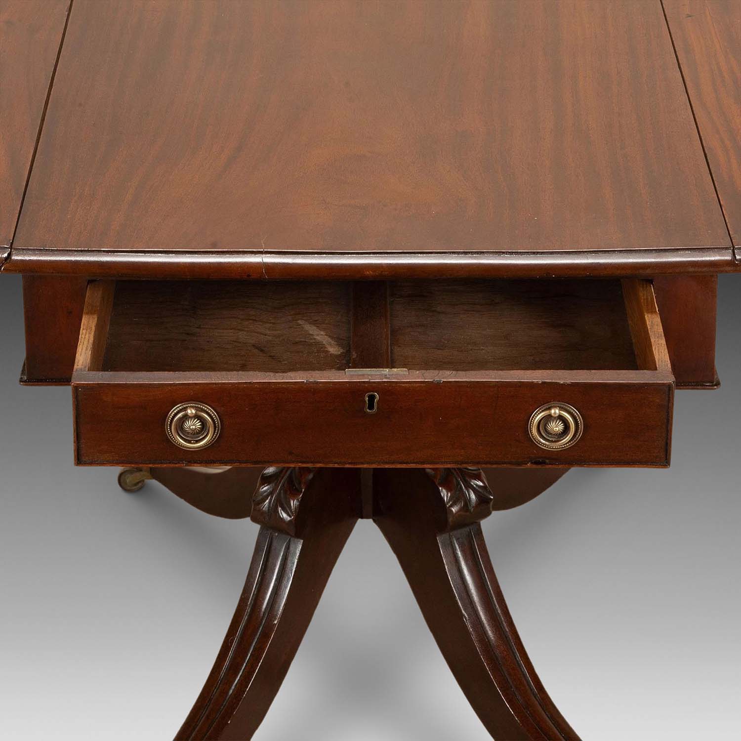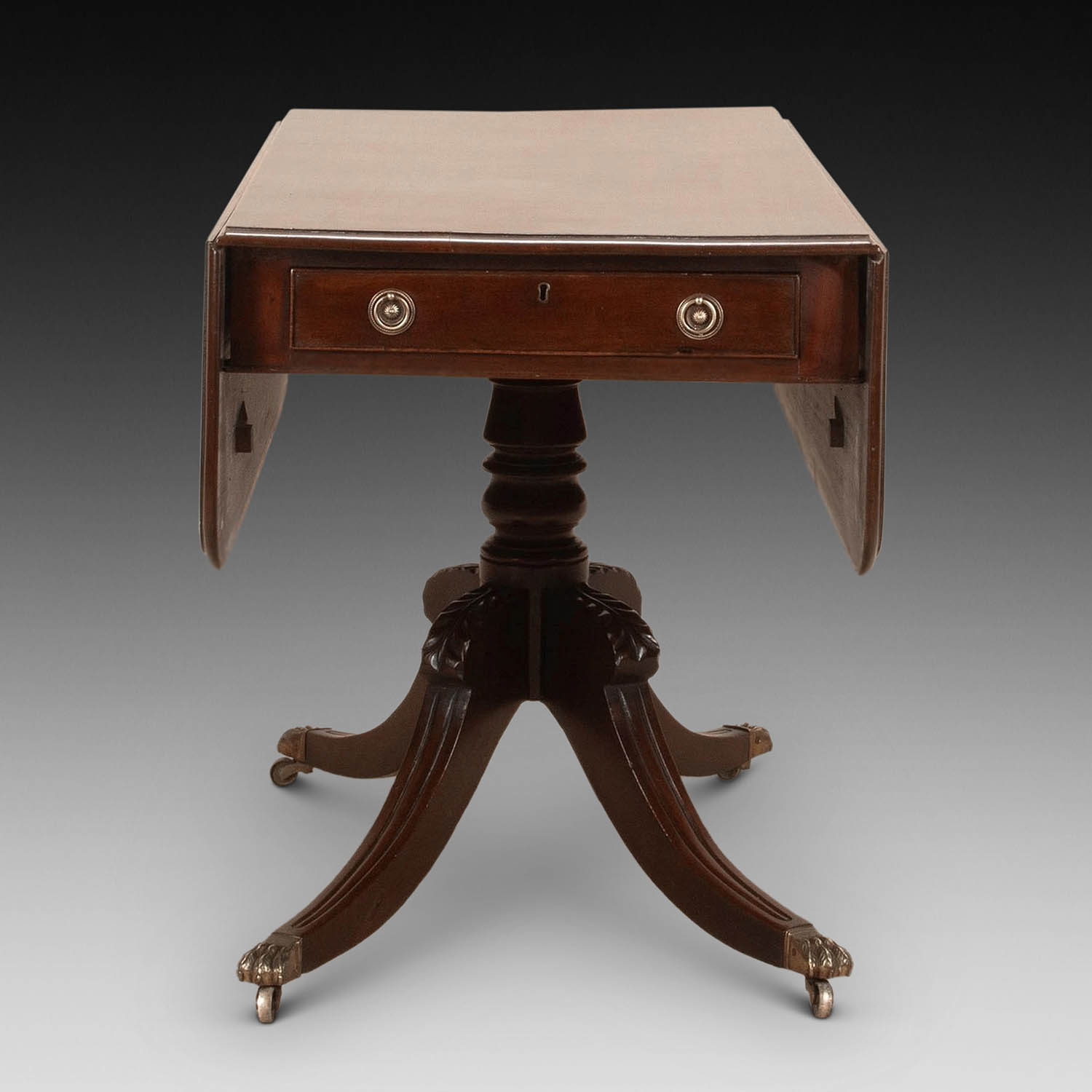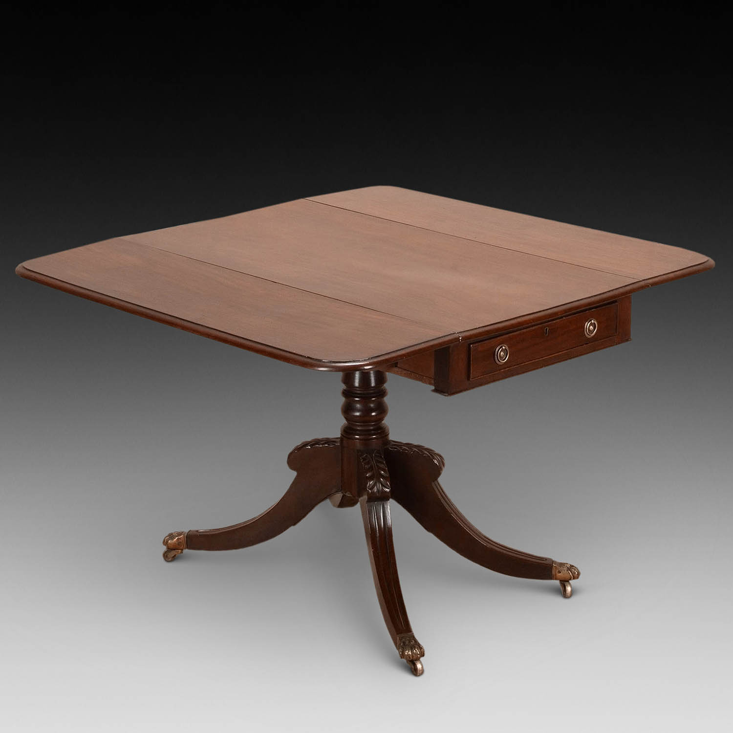 This lovely original piece can work as a side or centre table. Or even as a small dining (supper) table. With two drop leaves it is a versatile piece. With a small single drawer offering useful storage. The base has a turned pillar finished with four swept legs that are finished with their original brass claw castors.