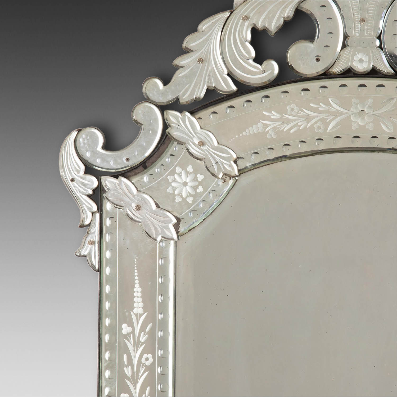 This beautiful mirror has a fabulous engraved glass decorative frame that sits around the original bevelled mirror glass. It also is of good proportions for a mirror of this style.