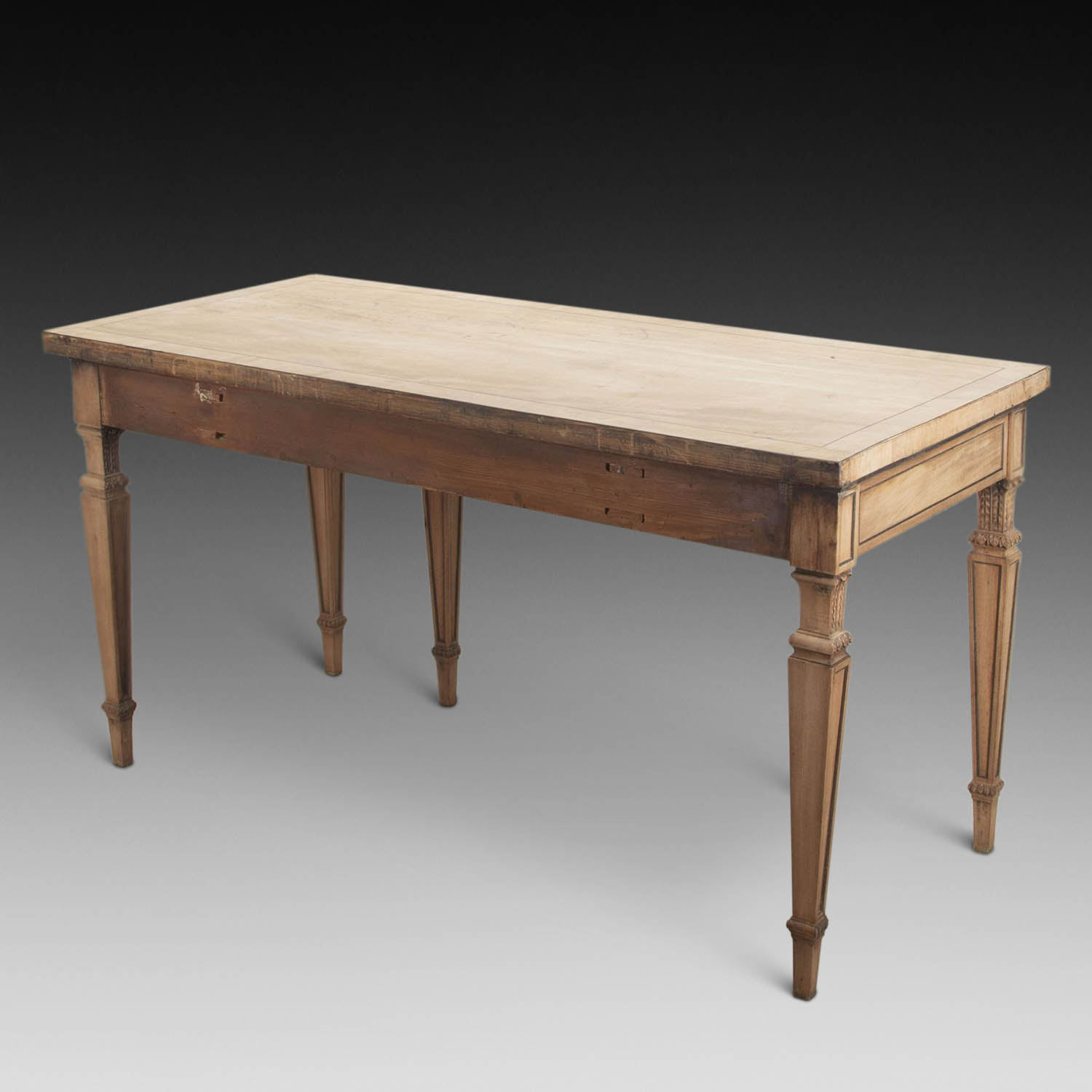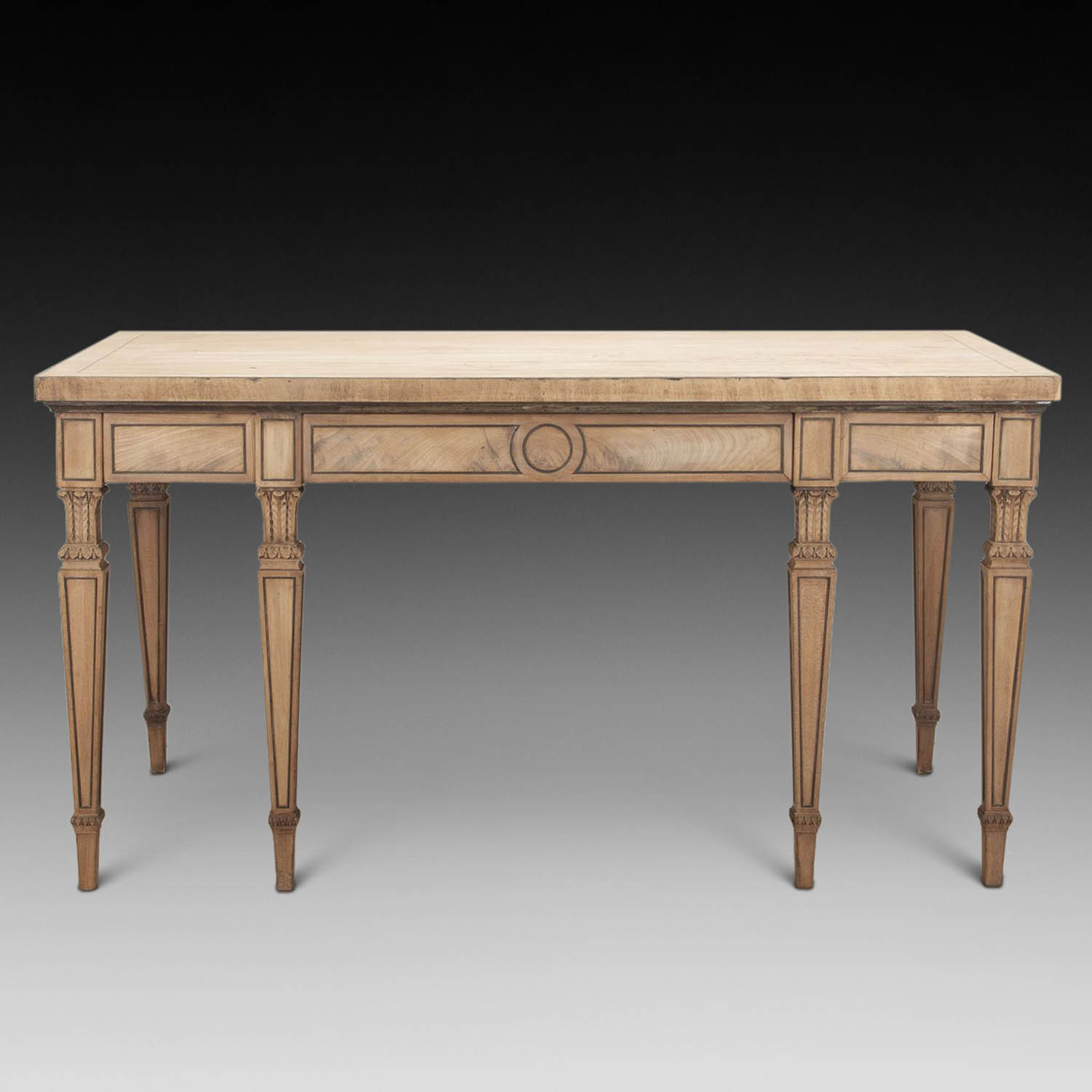This beautiful piece has three working drawers and stands on six beautiful tapering legs with carved decoration. A lovely table with mixing classic design with a bleached natural finish.